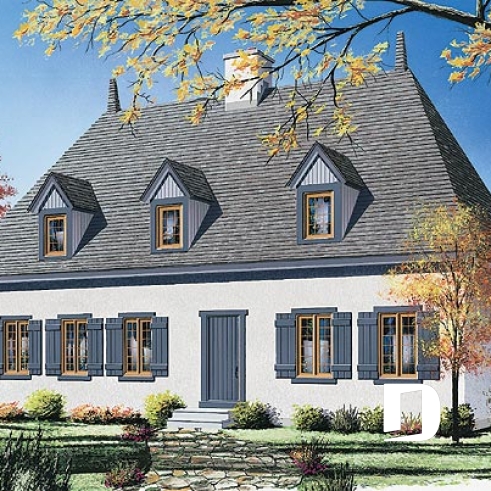 Vue avant - MODÈLE DE BASE - Maison de style Normand ancestral, 4 chambres, espace ouvert, 2 séjours, foyer central - Philibert