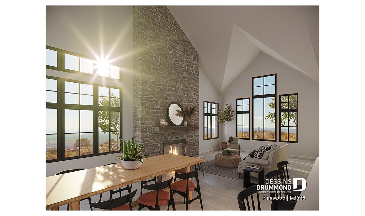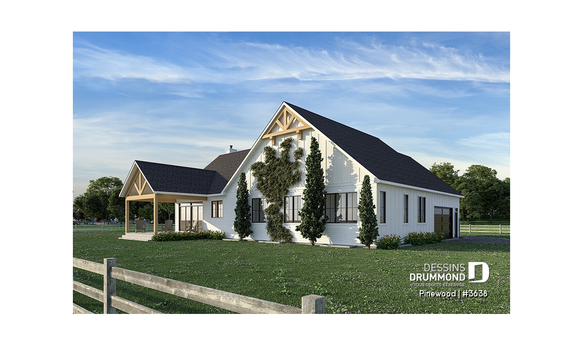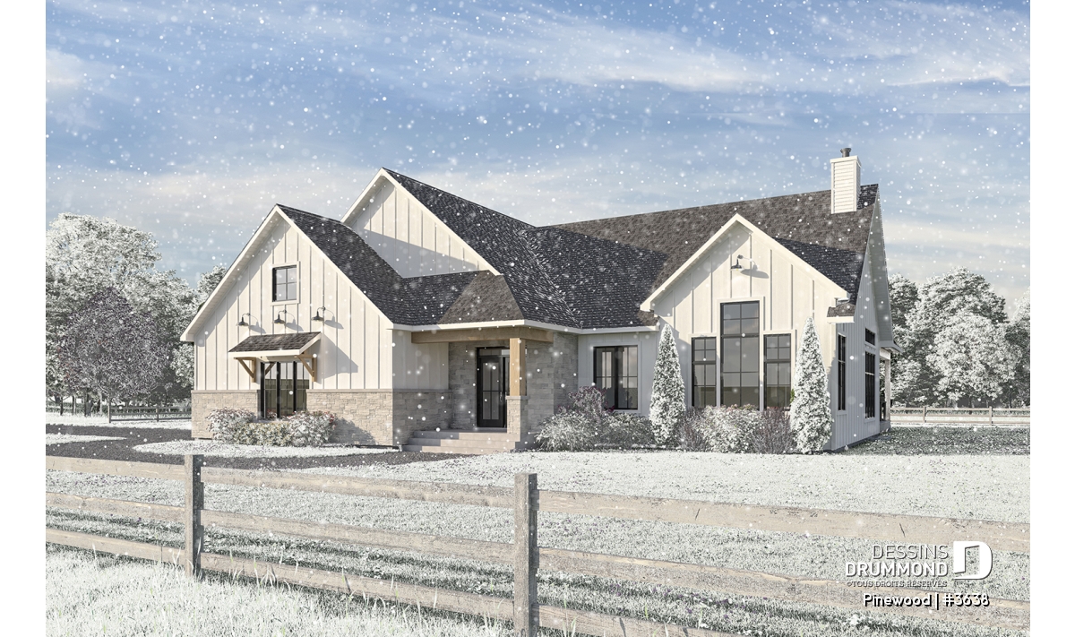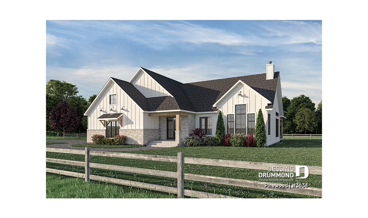 Le plan de maison de type plain-pied PINEWOOD (#3638) propose 2039 pi.ca. de surface aménagée au rez-de-chaussée. La particularité de cette maison de style farmhouse moderne, c’est que le garage est latéral permettant donc ainsi de bâtir sur un terrain en coin de rue par exemple. De plus, tous les plafonds du rez-de-chaussée sont à 9’ de hauteur sauf à la salle à manger et salle de séjour, où le plafond cathédrale atteint respectivement 18’8’’ et 15’5’’, donnant ainsi une belle amplitude à ce secteur familial névralgique de la maison.