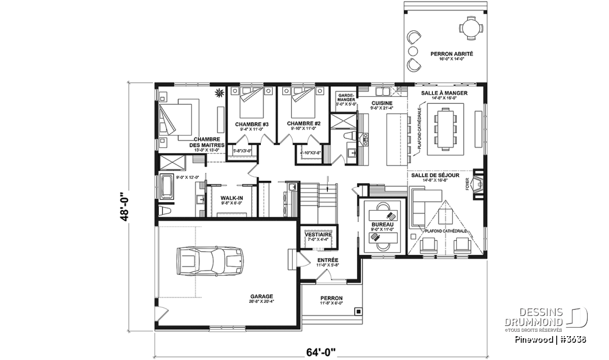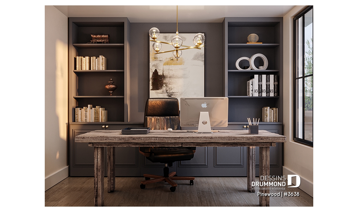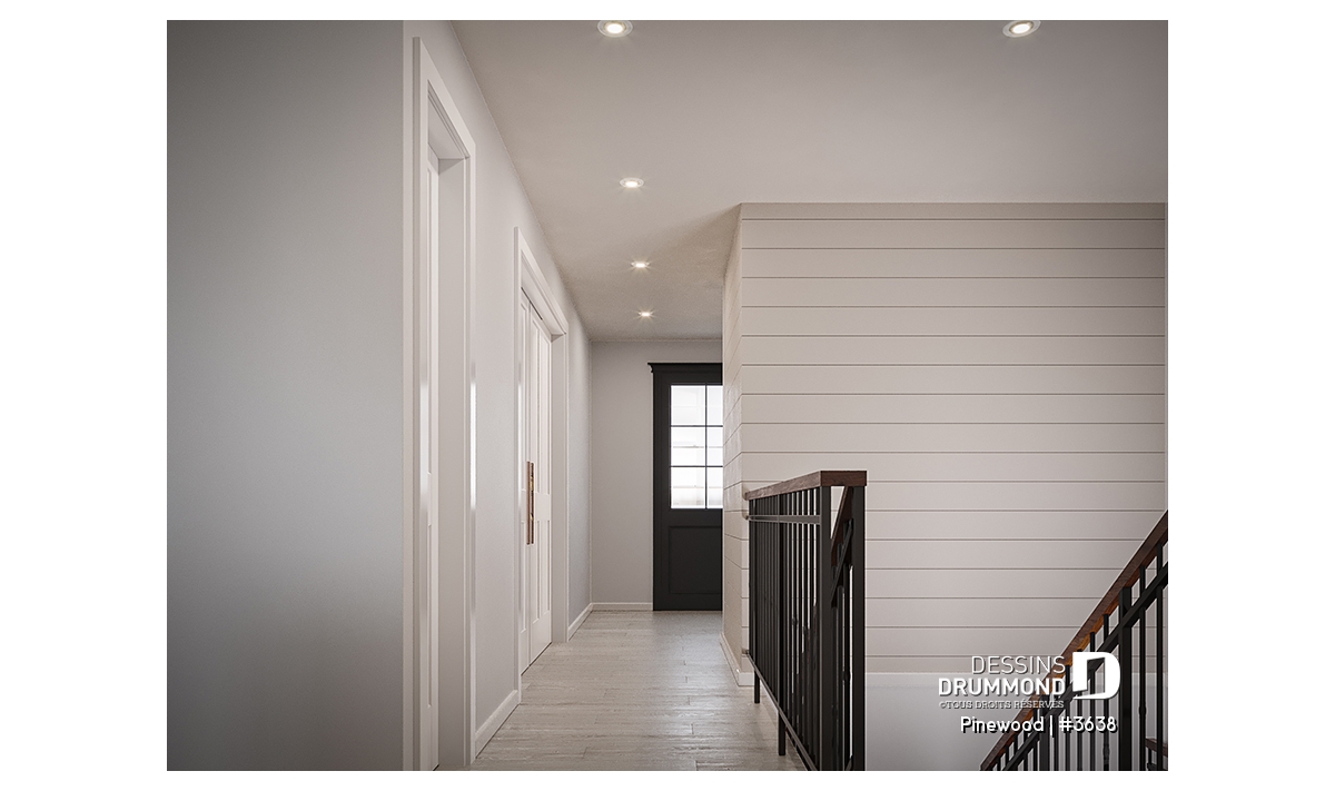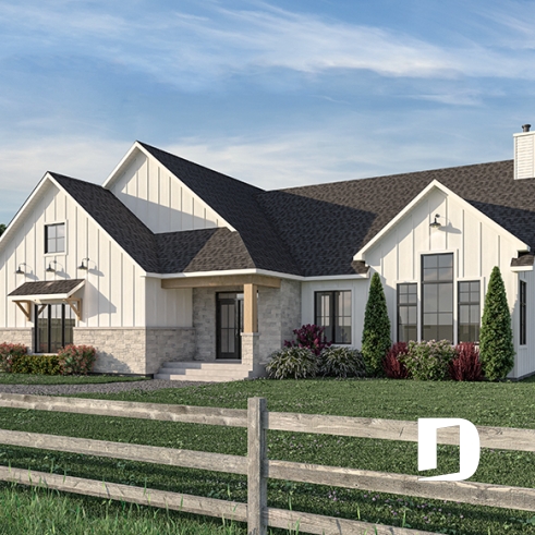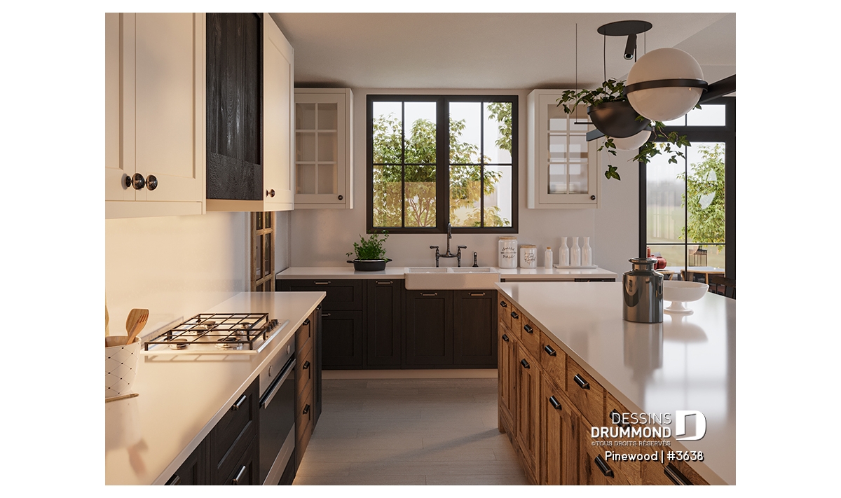 Le plan de maison de type plain-pied PINEWOOD (#3638) propose 2039 pi.ca. de surface aménagée au rez-de-chaussée. La particularité de cette maison de style farmhouse moderne, c’est que le garage est latéral permettant donc ainsi de bâtir sur un terrain en coin de rue par exemple. De plus, tous les plafonds du rez-de-chaussée sont à 9’ de hauteur sauf à la salle à manger et salle de séjour, où le plafond cathédrale atteint respectivement 18’8’’ et 15’5’’, donnant ainsi une belle amplitude à ce secteur familial névralgique de la maison.