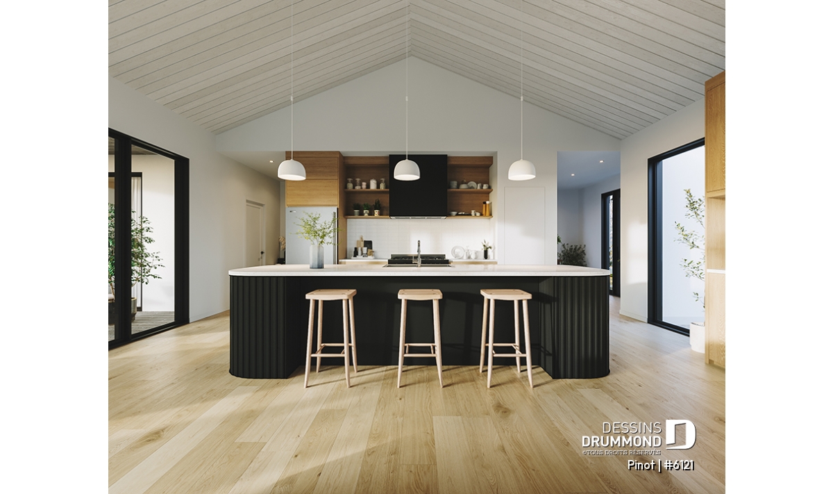 Cuisine avec grand garde-manger à proximité, un imposant îlot central ainsi qu'un cellier vitré.