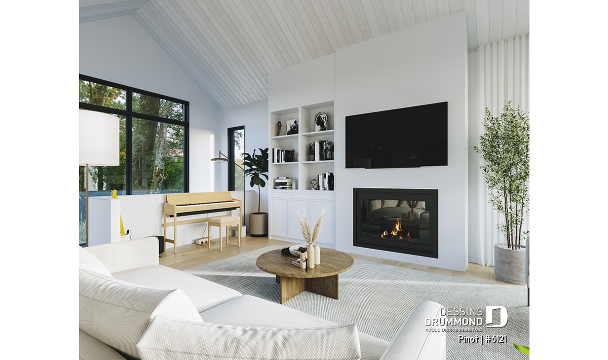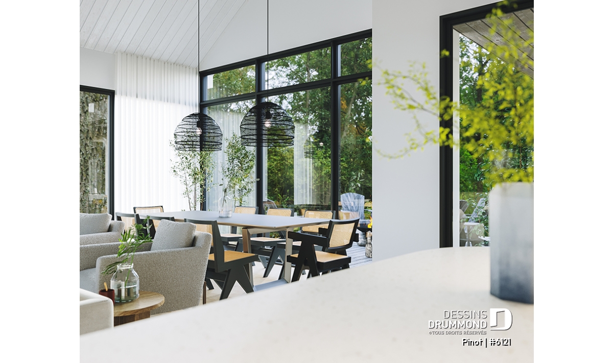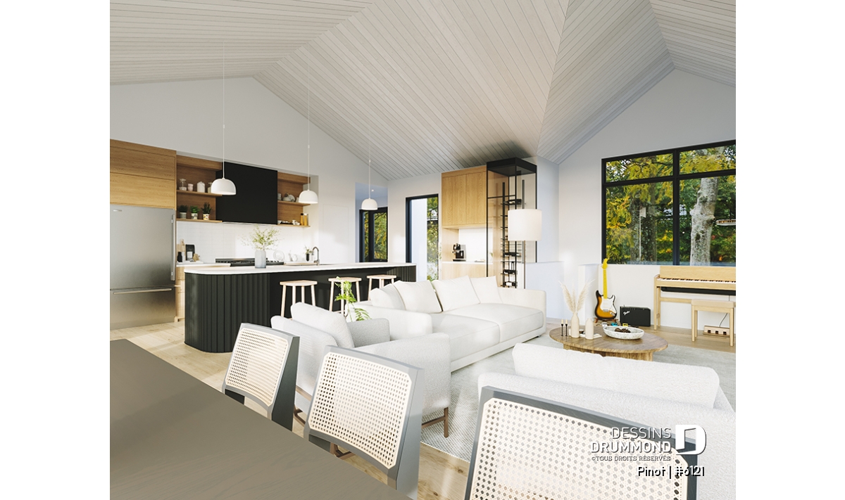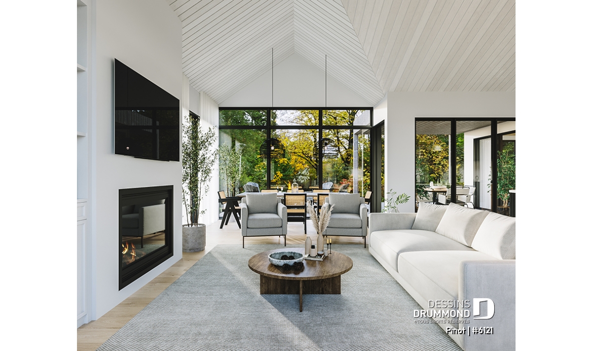 La salle de séjour se distingue par son plafond cathédral et son foyer chaleureux, ouverte directement sur la salle à manger baignée de lumière grâce à ses grandes fenêtres donnant sur la cour arrière. Cet espace de vie à aire ouverte respire la convivialité et met en valeur l’architecture nordique, axée sur la luminosité et le bien-être.
