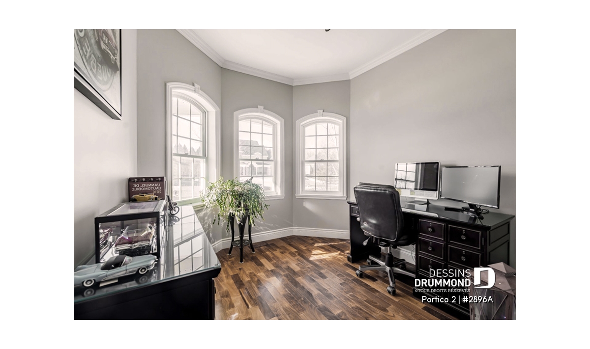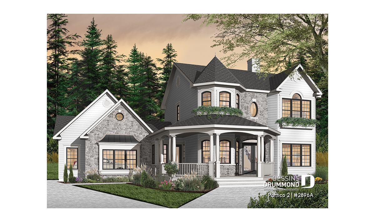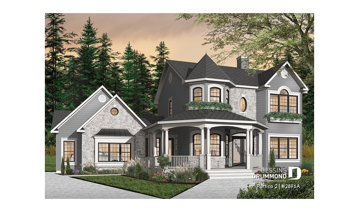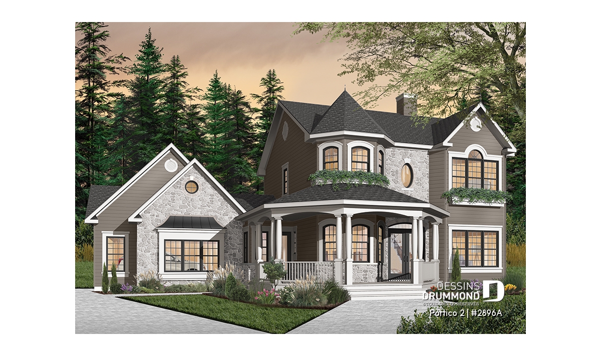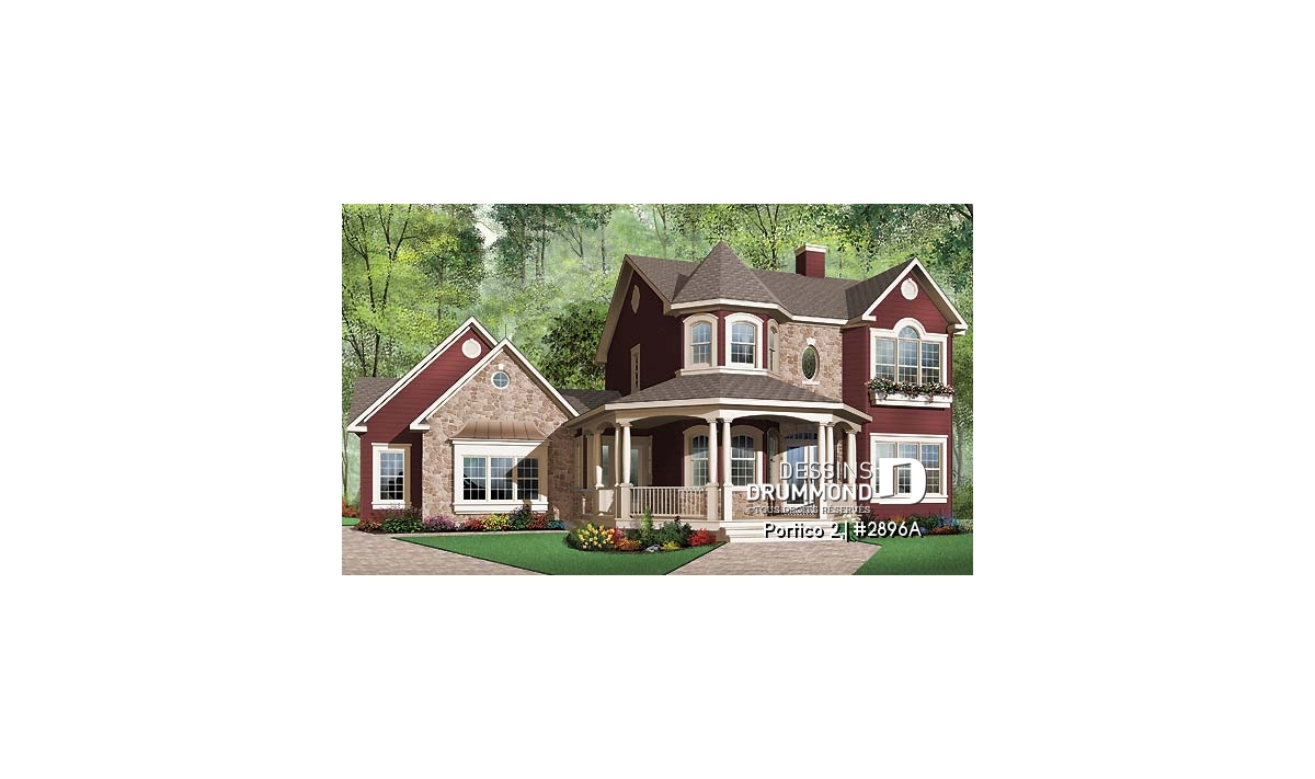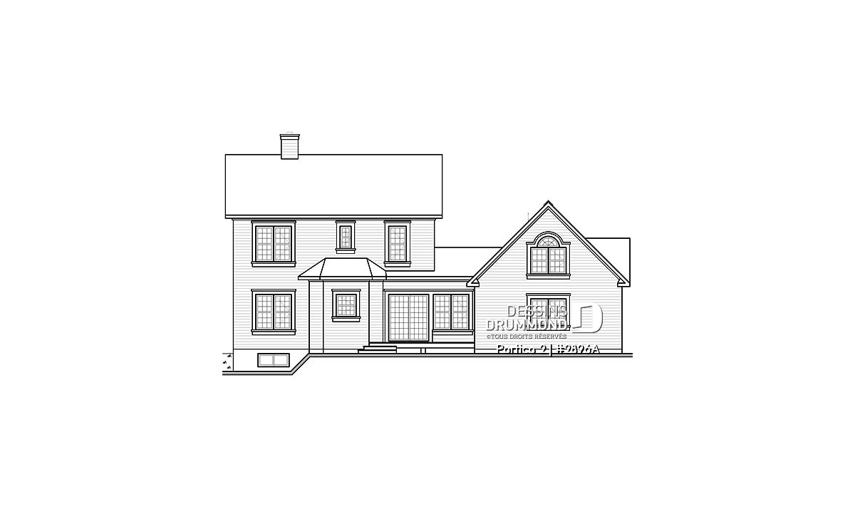 L’accès latéral au garage offre la possibilité de réaliser, en façade principale, un volume fenêtré des plus attrayants contribuant de près à la popularité et au chic de ce modèle. Pour une version encore plus américaine, proposant une chambre des maîtres au rez-de-chaussée, voir le modèle 2898.