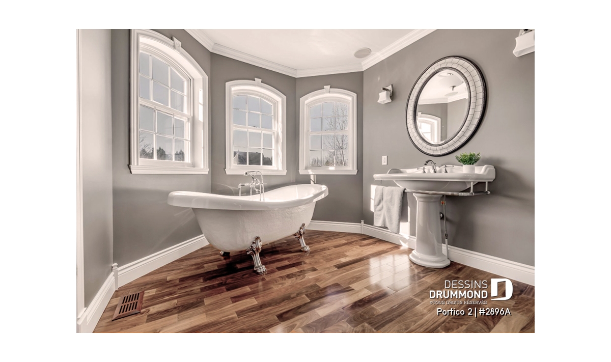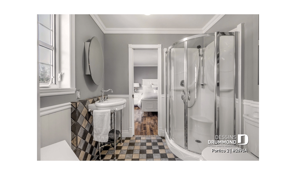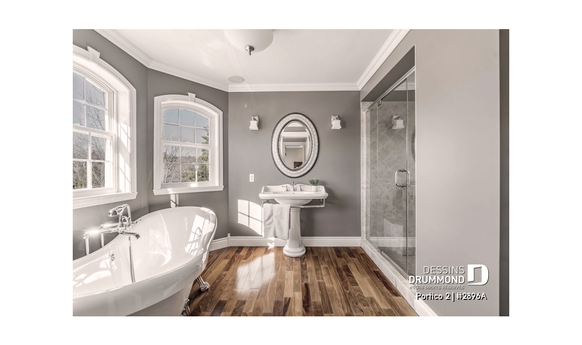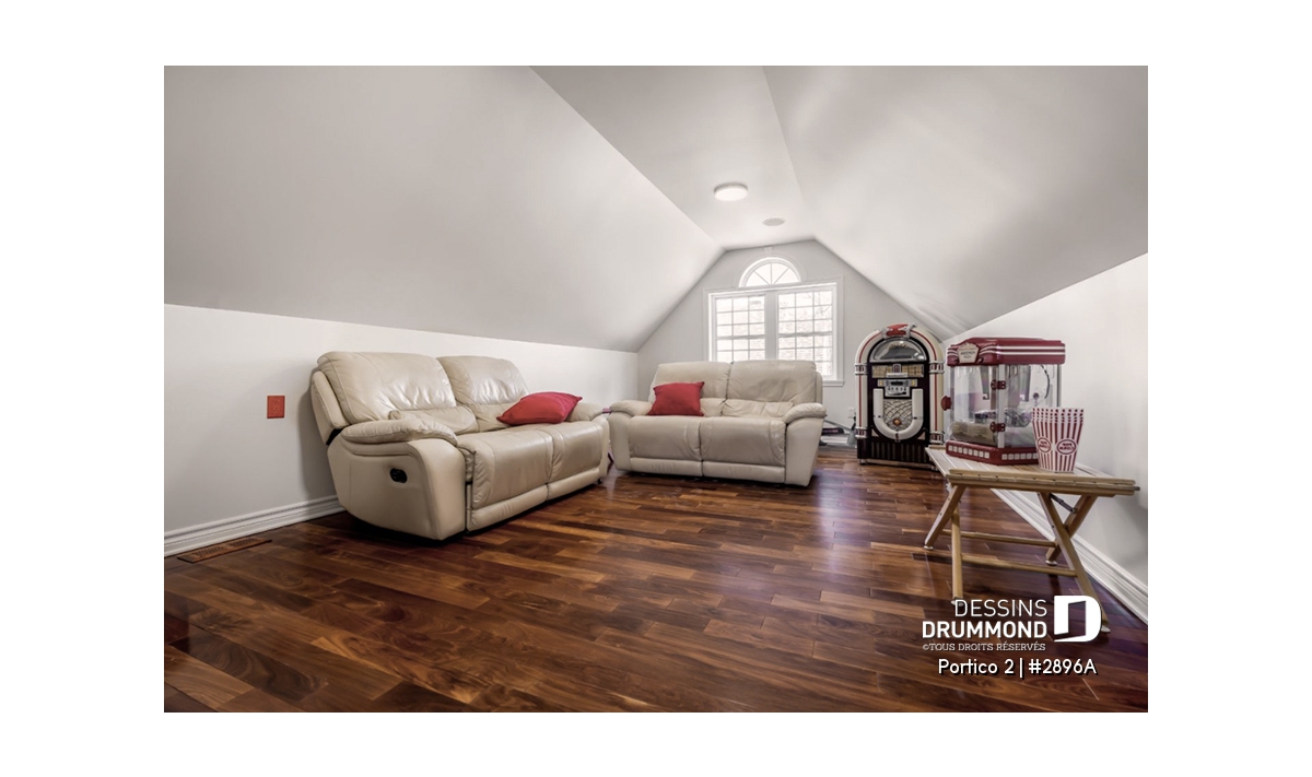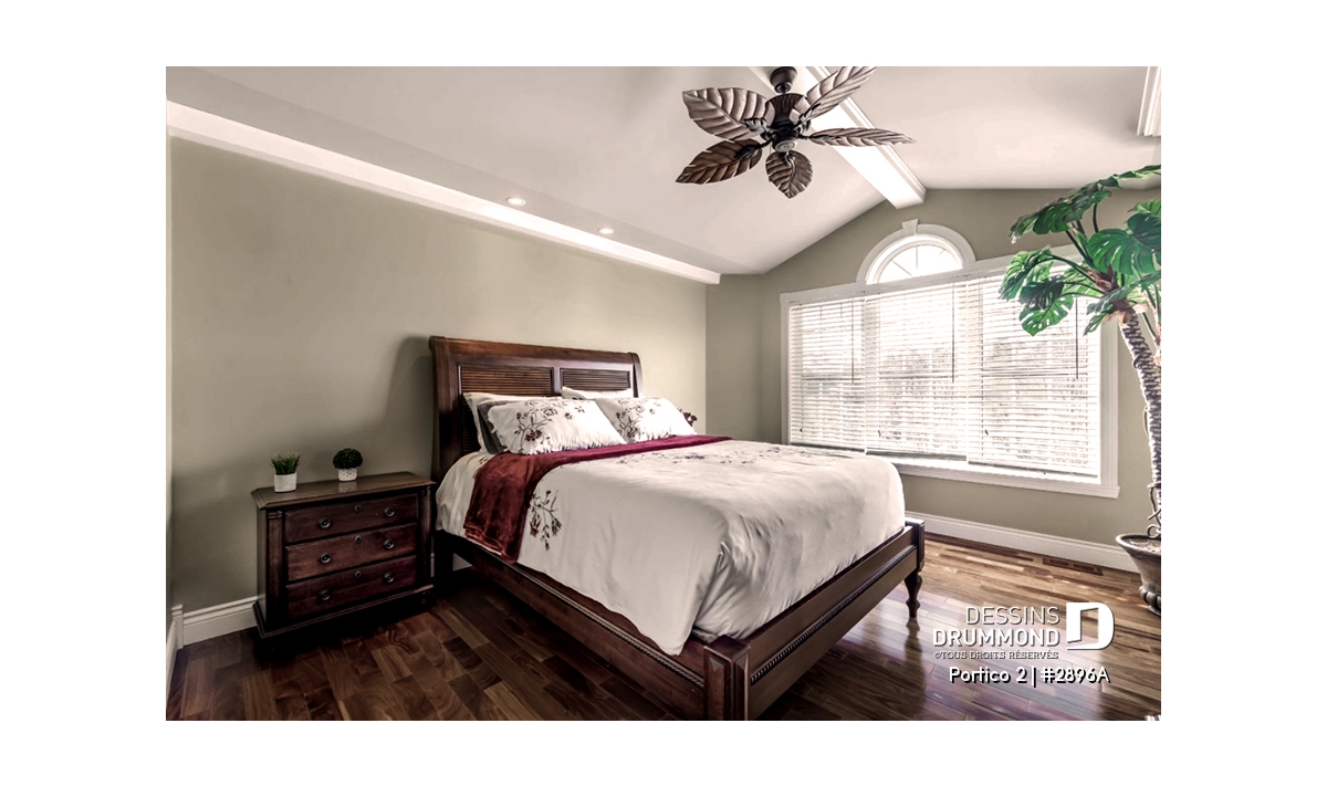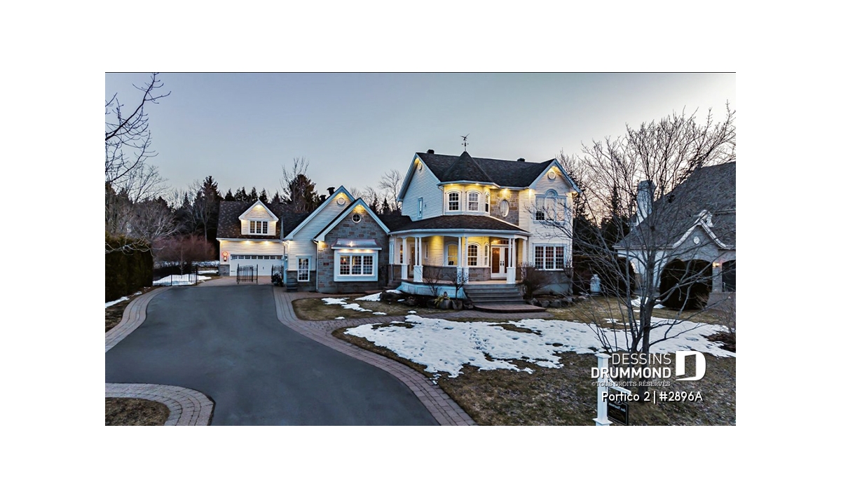L’accès latéral au garage offre la possibilité de réaliser, en façade principale, un volume fenêtré des plus attrayants contribuant de près à la popularité et au chic de ce modèle. Pour une version encore plus américaine, proposant une chambre des maîtres au rez-de-chaussée, voir le modèle 2898.