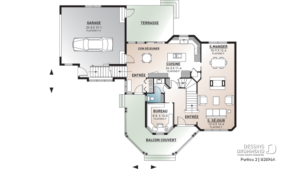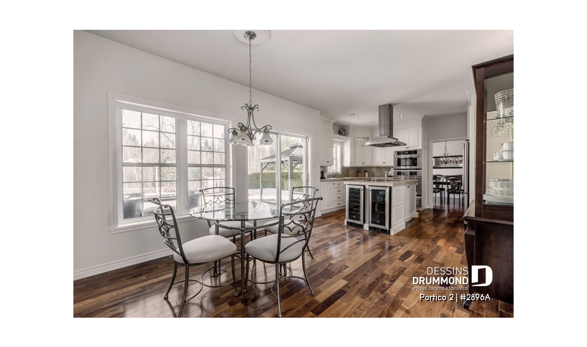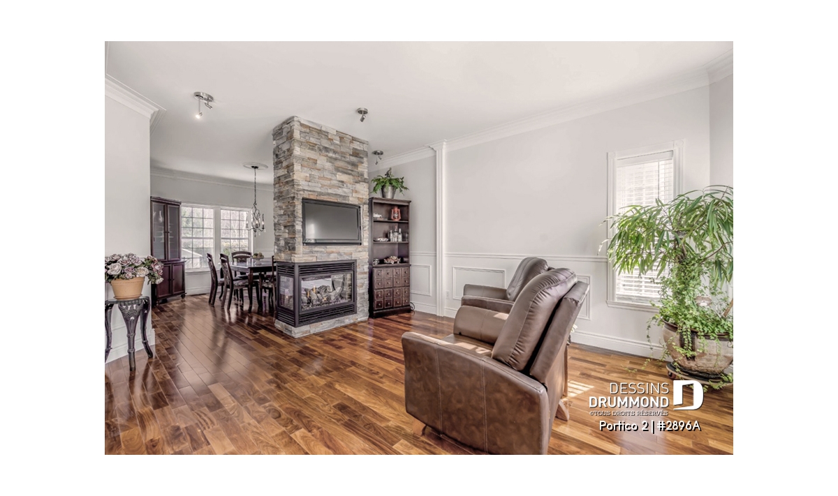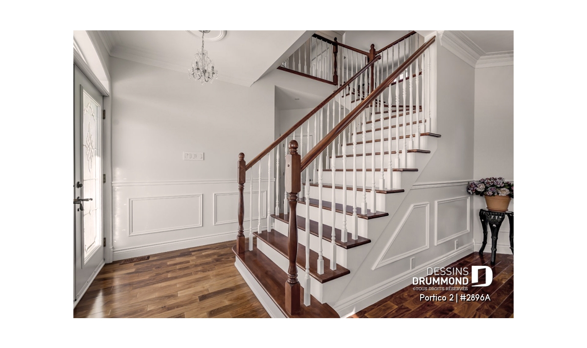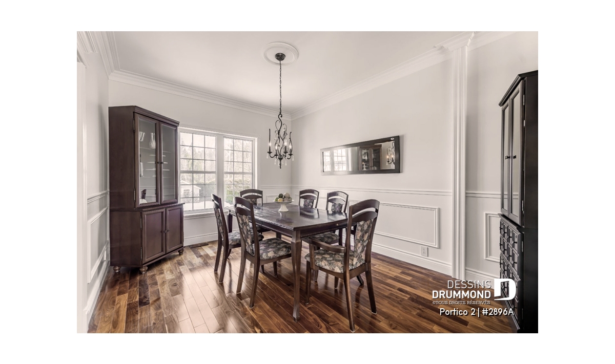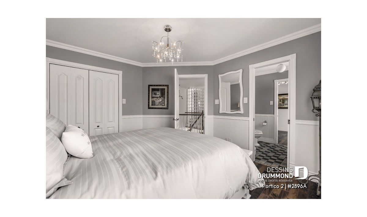 L’accès latéral au garage offre la possibilité de réaliser, en façade principale, un volume fenêtré des plus attrayants contribuant de près à la popularité et au chic de ce modèle. Pour une version encore plus américaine, proposant une chambre des maîtres au rez-de-chaussée, voir le modèle 2898.