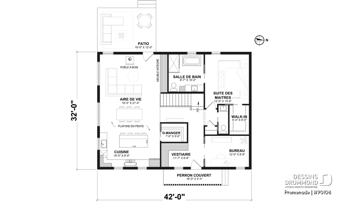 Plafond en pente, Bureau / Salle étude, Garde-manger, Walk-in ch. maîtres, Vestiaire, Aire ouverte, Poêle à bois, Bain et douche séparés, Suite des maîtres au rdc, Plafond à plus de 8'