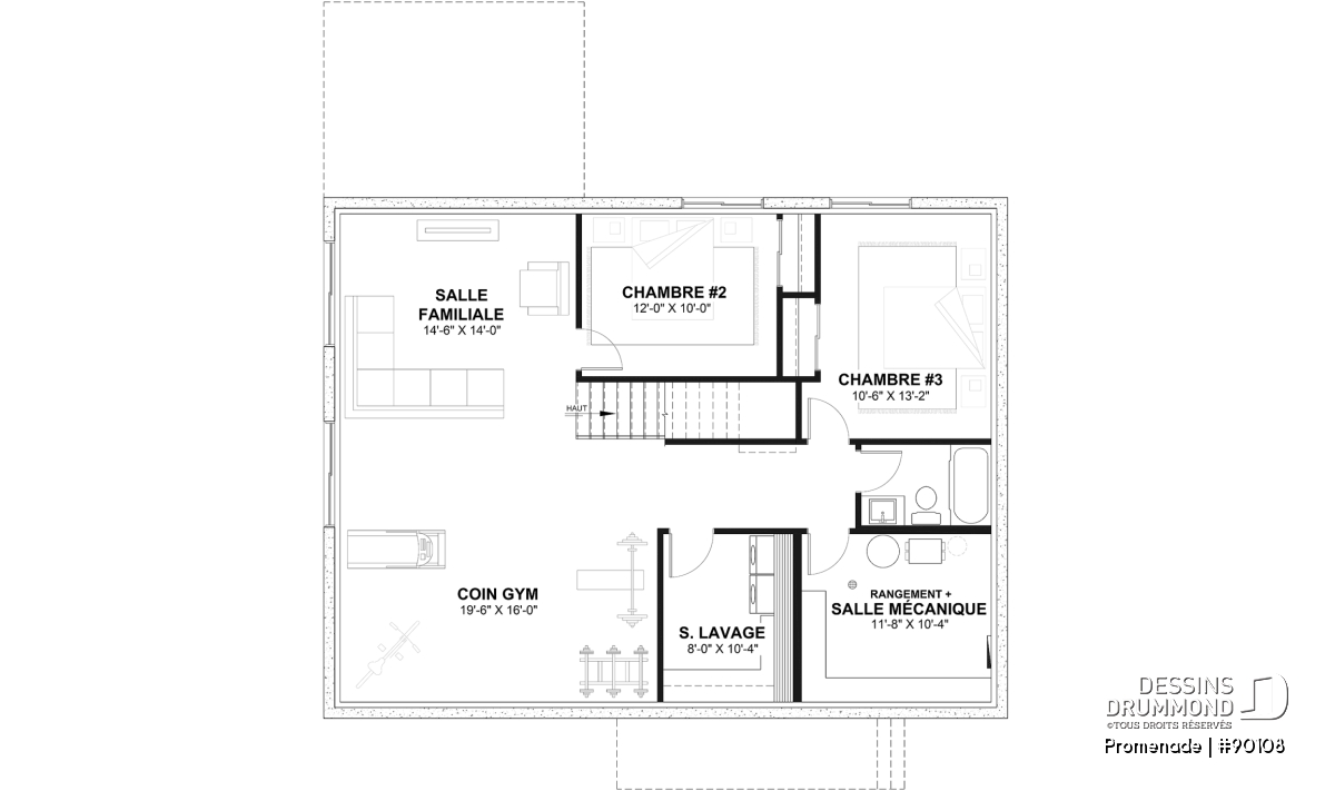 2 chambres et salle familiale, coin gym, salle de bain, salle de lavage et pièce mécanique avec rangement.