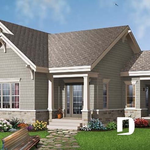 Petit bungalow abordable conçu pour baby-boomers, plafond 9', galerie couverte, buanderie, walk-in, vestibule