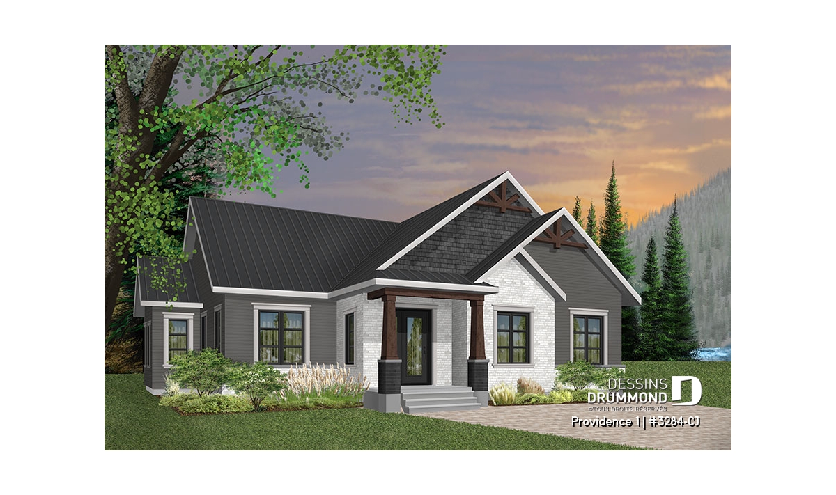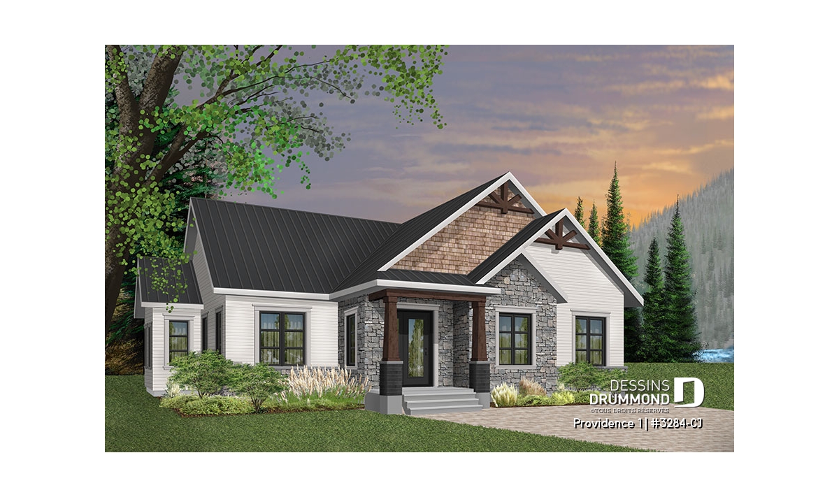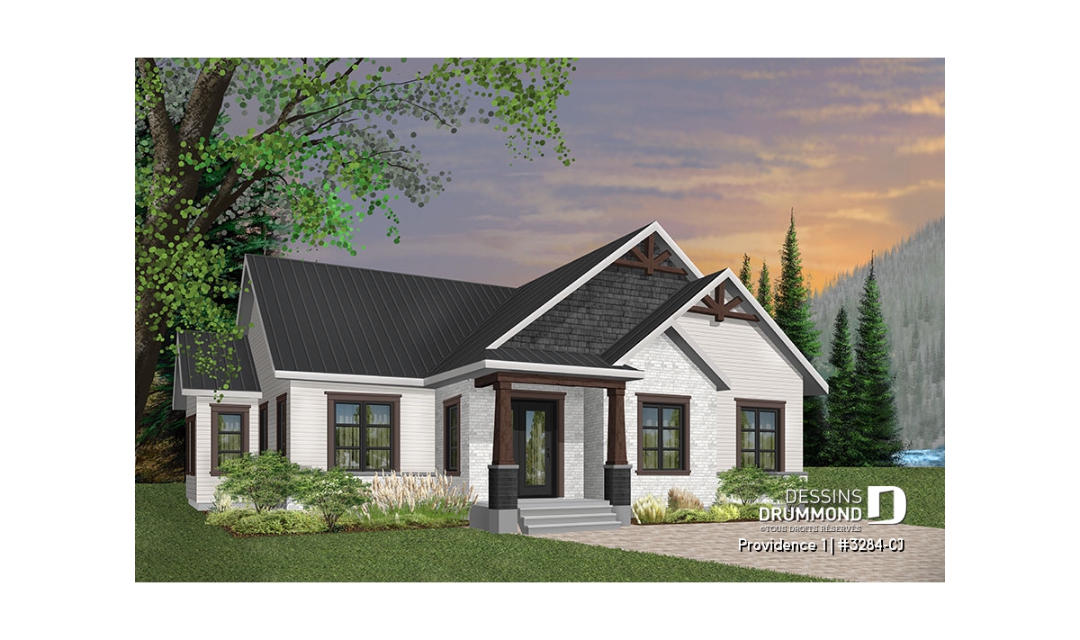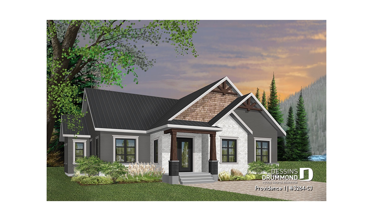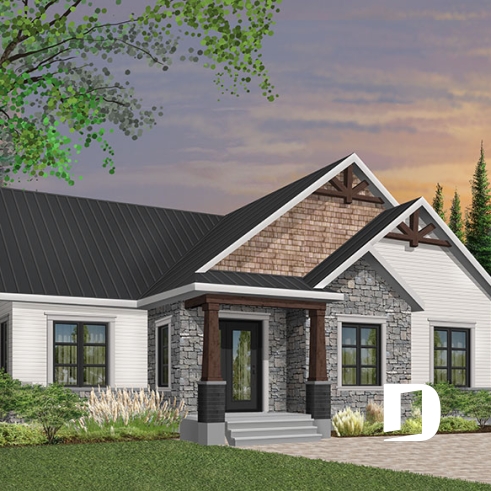 Se voulant répondre à une grande demande pour le style populaire de maison exposant des poutres de bois décoratives en façade, nous vous proposons ici le modèle de base de cette nouvelle collection de plans de maison de style Craftsman, ou champêtre rustique (ou nordique), offrant 3 chambres.