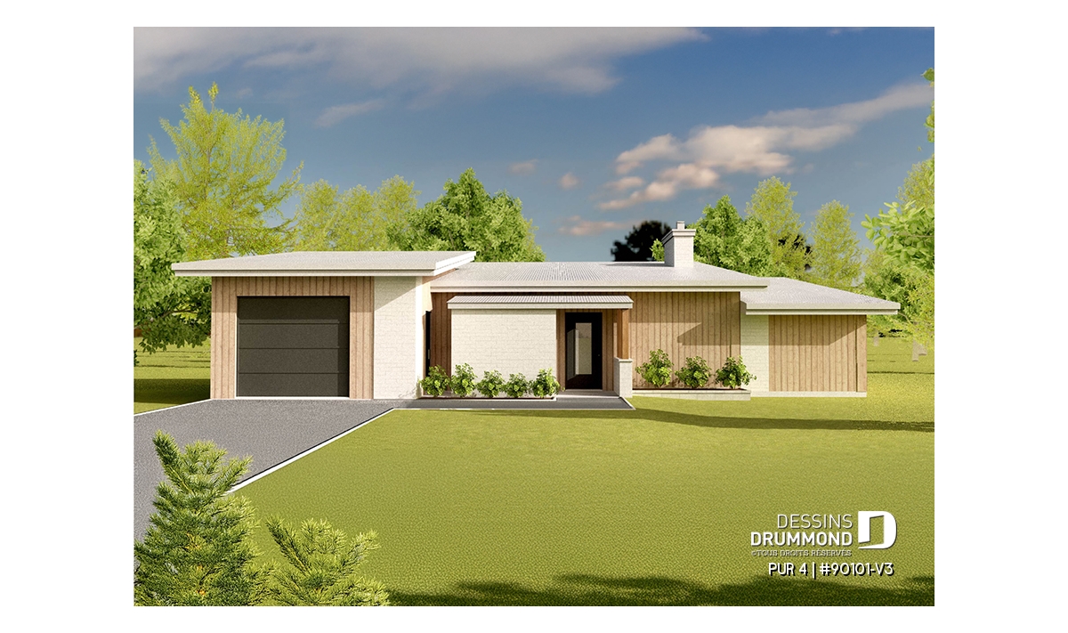 **Plan de petite maison éco-responsable de style contemporain proposant 3 chambres et un garage.