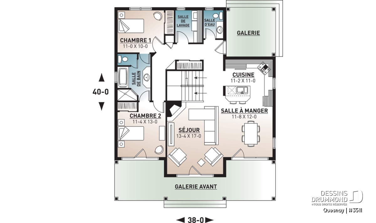 Ainsi, au rez-de-chaussée, tout le secteur activités propose une vue abondante sur l’arrière. La cuisine, complice de cette organisation, reçoit un îlot central permettant de cuisiner avec une vue sur le panorama. Ici, on ne peut passer sous silence l’aménagement de deux chambres avec chacune un accès à une salle de bain privée, fort bien organisée, et destinée à être partagée avec sa toilette et sa douche en cabine. L’espace buanderie sera certes fort apprécié à ce plancher alors qu’un coin toilette-lavabo, tout près de l’entrée de service, se révélera d’une grande utilité.
