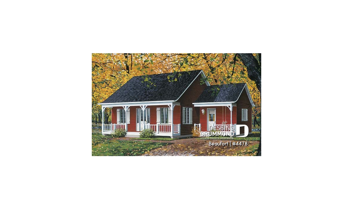 Plain-pied populaire style ranch, plan de maison avec 2 entrées, 2 chambres et galerie arbitrée