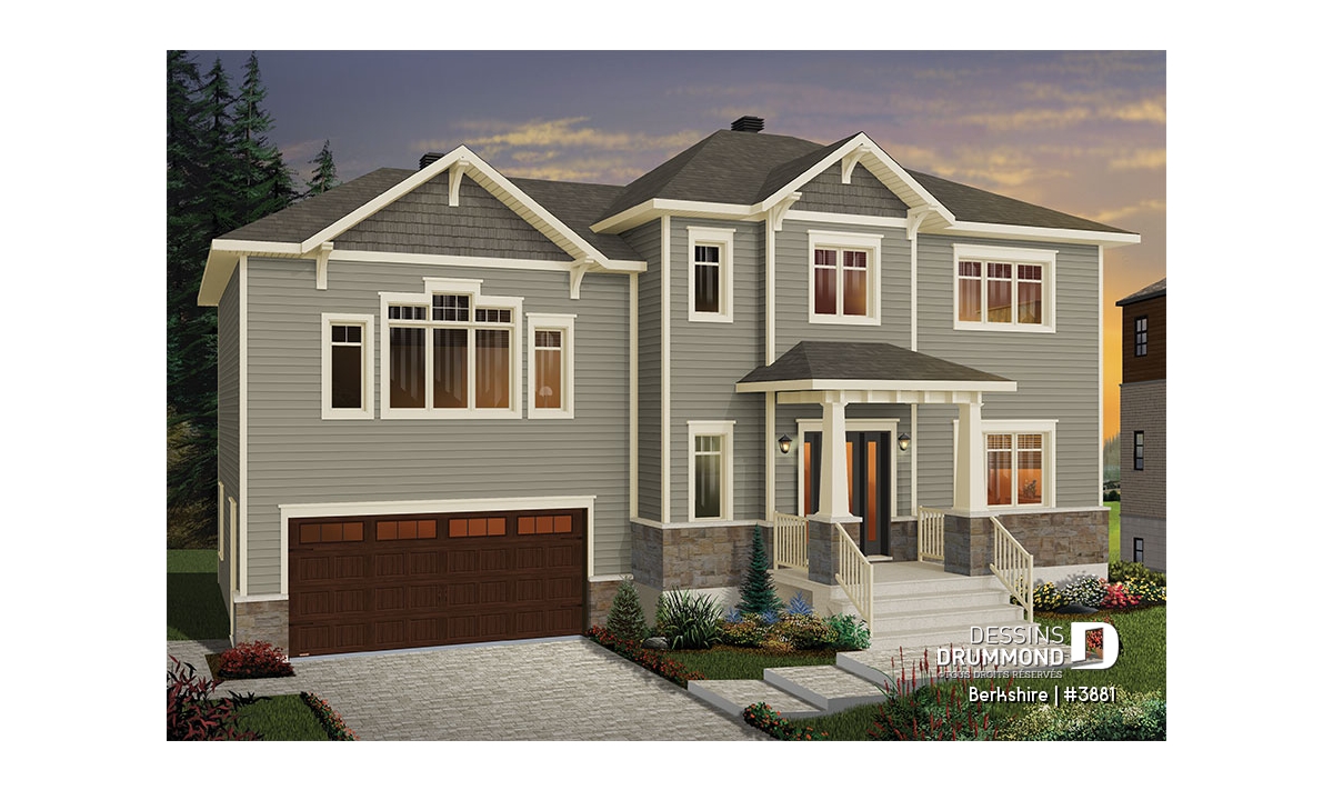 Vue avant - MODÈLE DE BASE - Plan de maison pour famille, 3 à 4 chambres, garage double, grand îlot à la cuisine, foyer - Berkshire