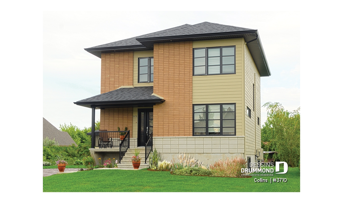 Vue avant - MODÈLE DE BASE - Plan maison contemporaine 3 chambres, grande cuisine avec garde-manger, buanderie au r-d-c, chute à linge - Collins