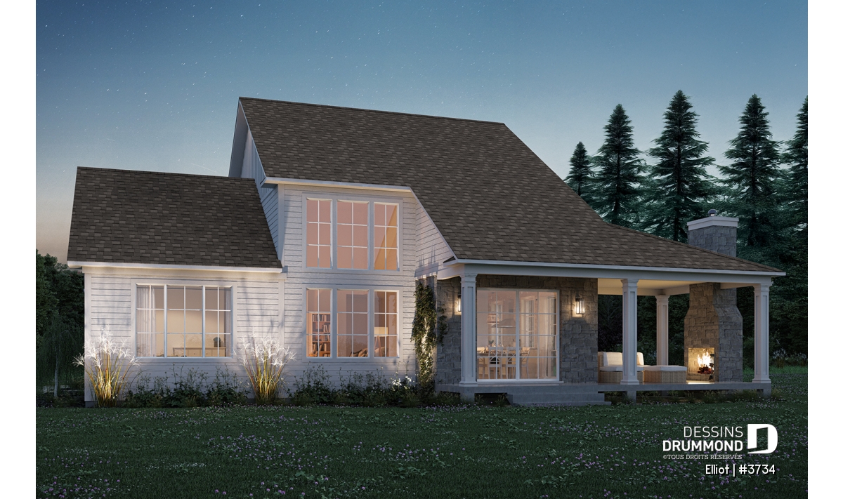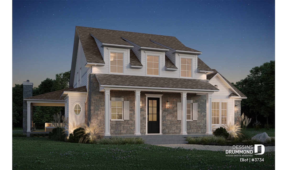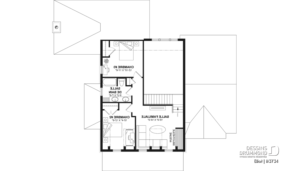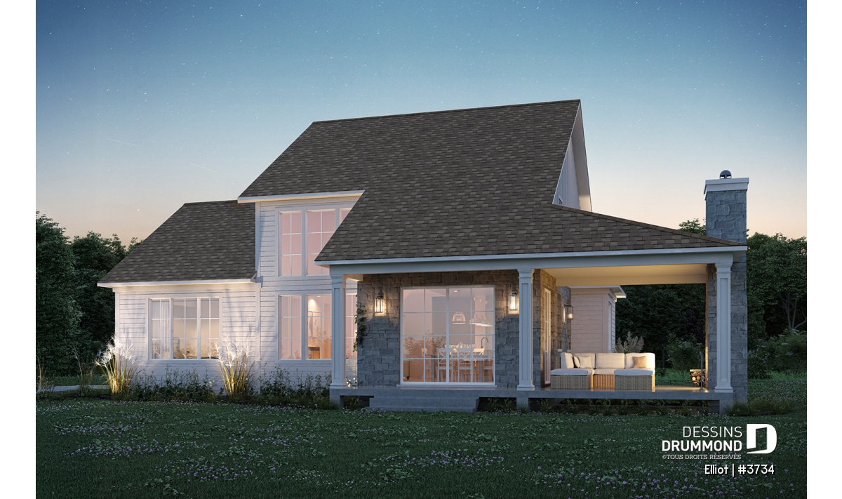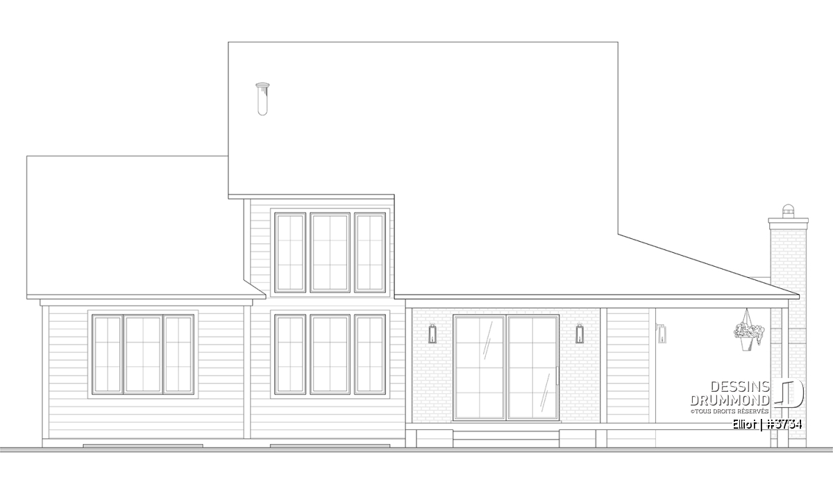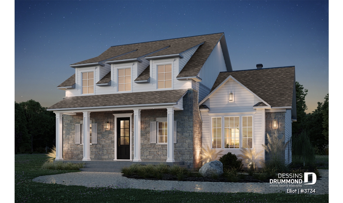 Le plan de maison ELLIOT (#3734) propose 2 268 pi² aménagés sur deux étages, avec un sous-sol non fini ajoutant 1 582 pi² supplémentaires.