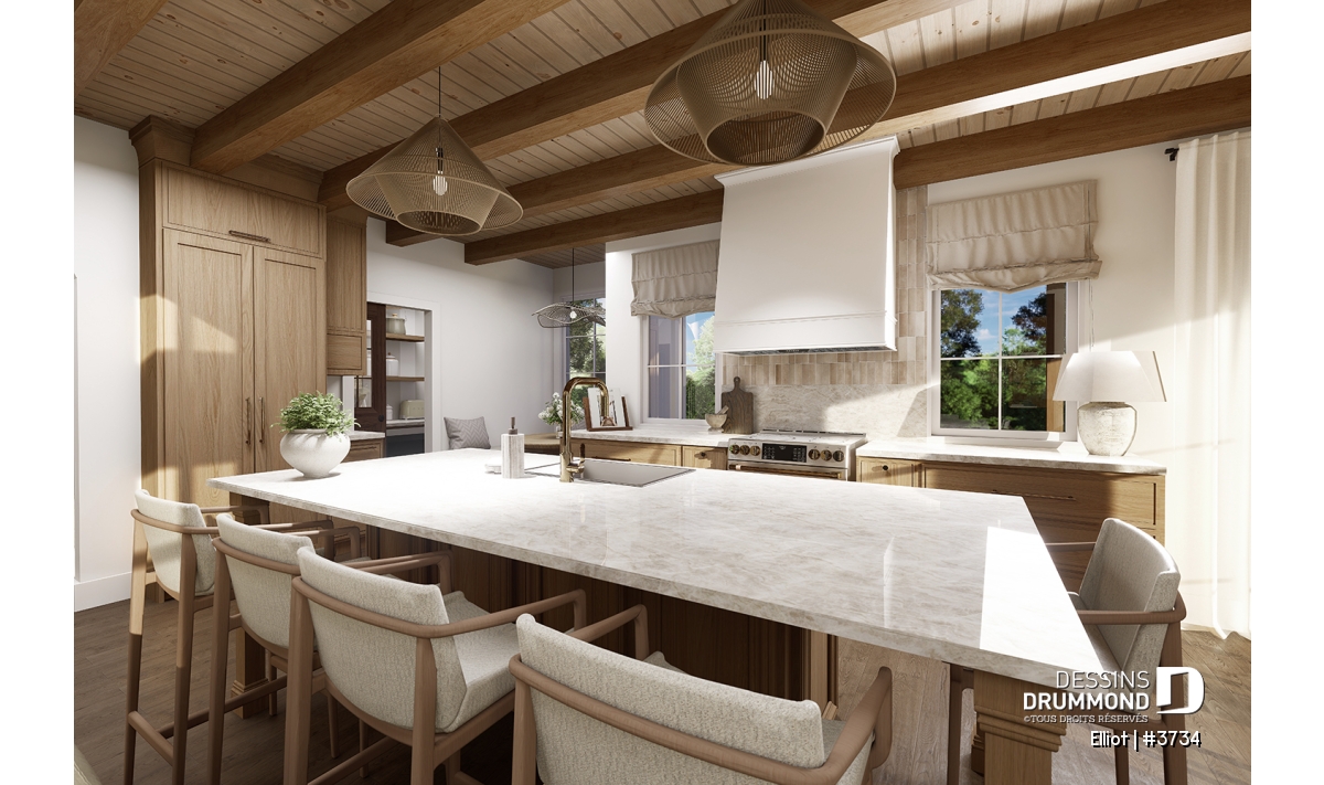 La cuisine, ouverte sur la salle à manger et le salon, regroupe plusieurs éléments qui feront le bonheur du chef de la maison ! À droite, une charmante dînette avec table ronde et banquette peut accueillir confortablement deux à trois personnes. Le garde-manger, quant à lui, inclut un évier, un cellier et un vaste espace de rangement pour vos denrées. Au cœur de la cuisine, un grand îlot de 9' x 3'6'' deviendra un lieu de rassemblement privilégié, que ce soit pour les enfants à l'heure des devoirs ou pour les adultes lors de l’apéro.