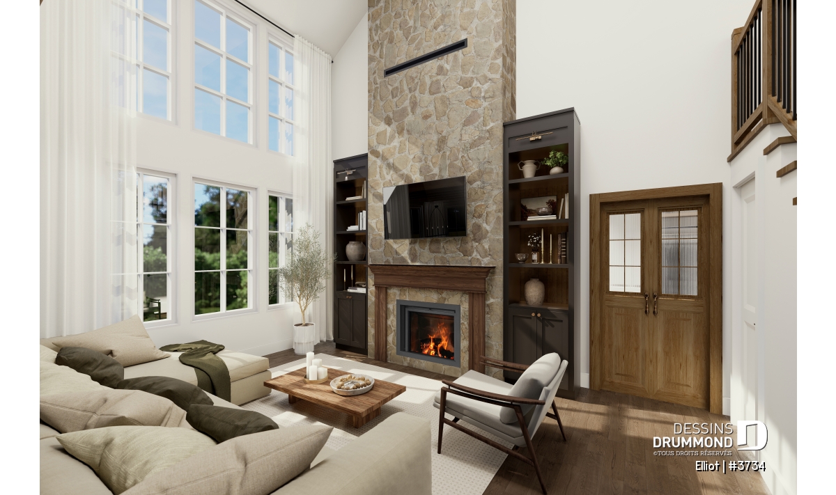 La cuisine s’ouvre sur un salon majestueux au plafond de 18'4", apportant une impressionnante sensation de grandeur. Au cœur de cet espace trône un foyer central, véritable signature du plan. Le modèle proposé, le foyer à bois STÛV s21, combine performance et design élégant. Il devient le point focal du séjour en apportant chaleur, ambiance scandinave et charme intemporel aux soirées en famille ou entre amis. De grandes fenêtres donnant sur la cour arrière baignent la pièce de lumière naturelle et renforcent cette atmosphère conviviale.