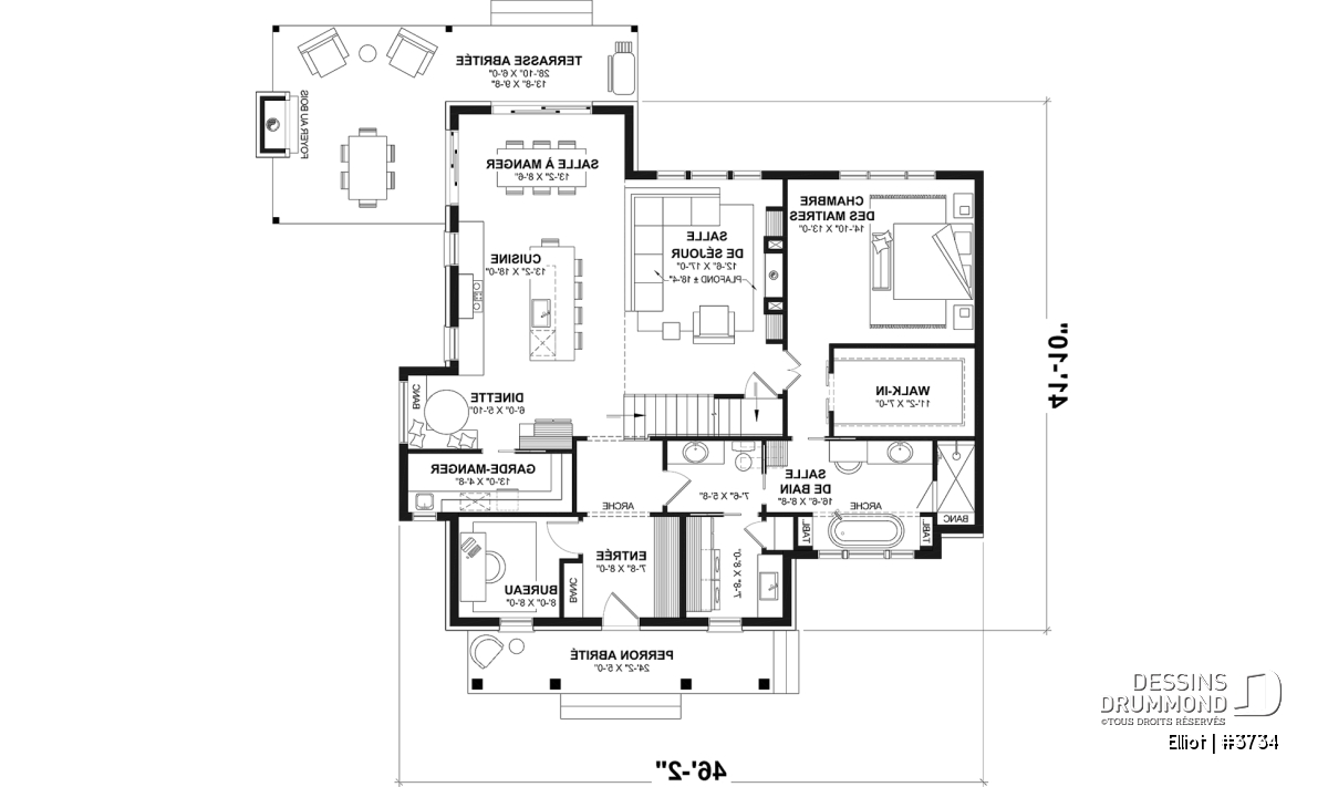 Arche, Dinette / Coin déjeuner, Foyer, Galerie 2-3 côtés, Garde-manger, Ouvert sur 2 étages, Banquette, Bureau / Salle étude, Bain et douche séparés, Suite des maîtres au rdc, Walk-in ch. maîtres, Meuble(s) encastré(s), Aire ouverte, Ilôt, Plafond à plus de 8', Terrasse abritée, Lavabo double, Tablettes, Plafond en pente
