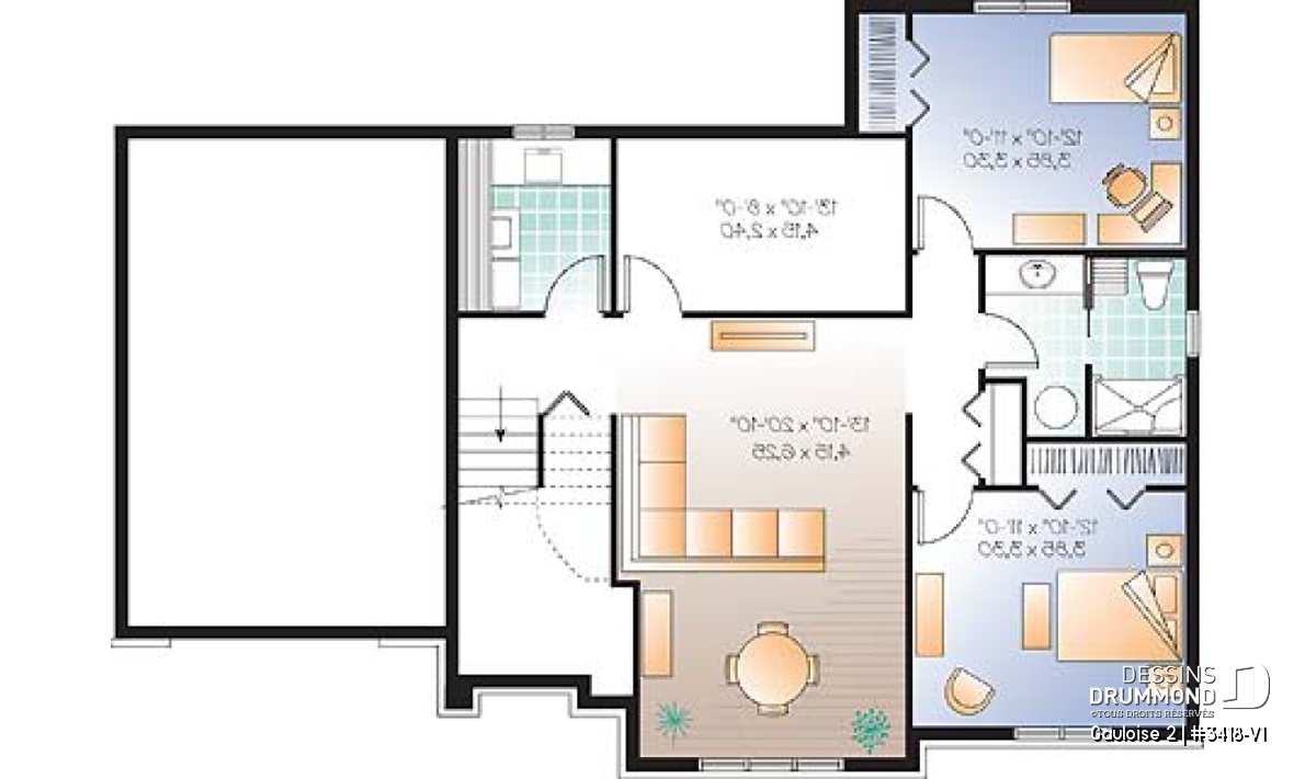 Avec cette demande croissante pour des modèles de maison offrant 4 chambres, Dessins Drummond se fait un plaisir de répondre aux attentes de sa clientèle en proposant des plans comme ce 3418-V1, conçu à partir du très populaire modèle 3418 et suggérant à la fois un aménagement intérieur de 4 chambres et plein d’utilités.