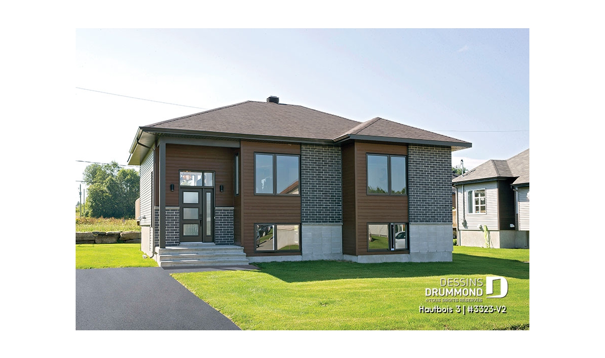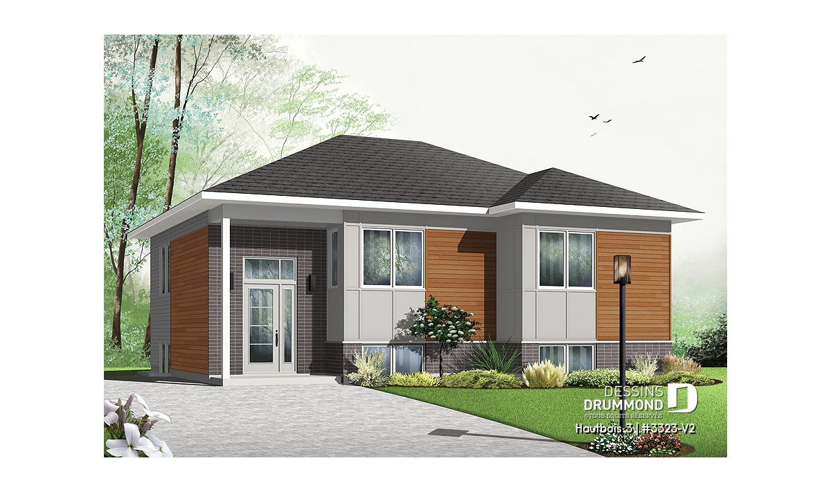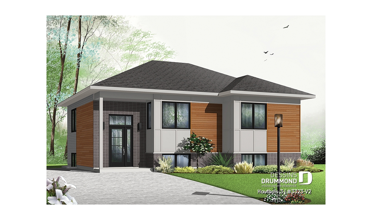 Plan de bungalow de type split-level contemporain, 2 chambres, aire ouverte, sous-sol aménageable,