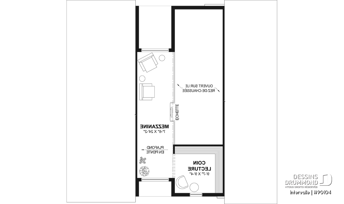Plafond de 8' en pente à la mezzanine et de 5'6'' au coin lecture.
