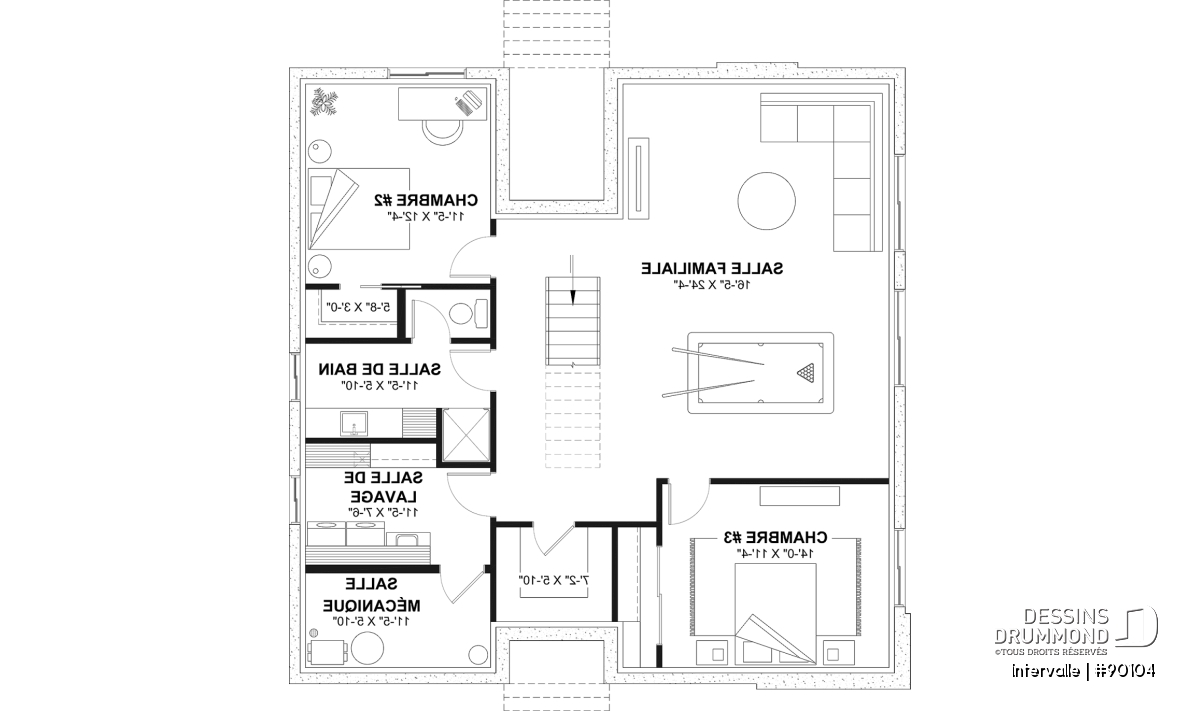 2 chambres, salle mécanique, rangement, salle de bain, salle de lavage, salle familiale (ou chambre #4) et salle de jeux.