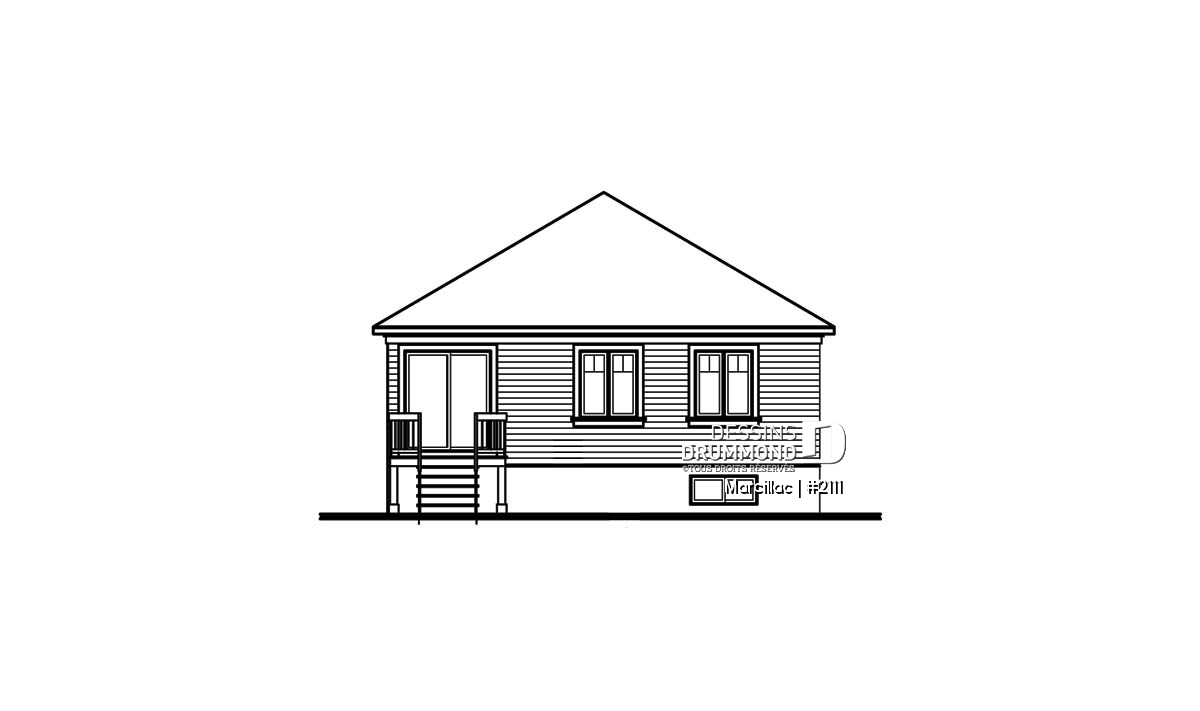 Vue avant - MODÈLE DE BASE - Plan de bungalow de 3 chambres pour petit budget, fenestration abondante, salon en contrebas - Marcillac