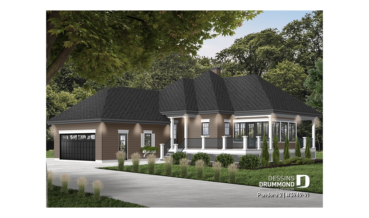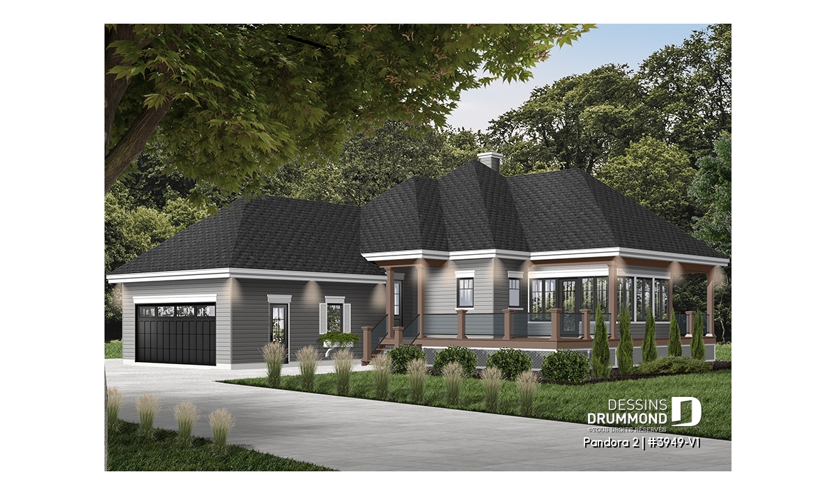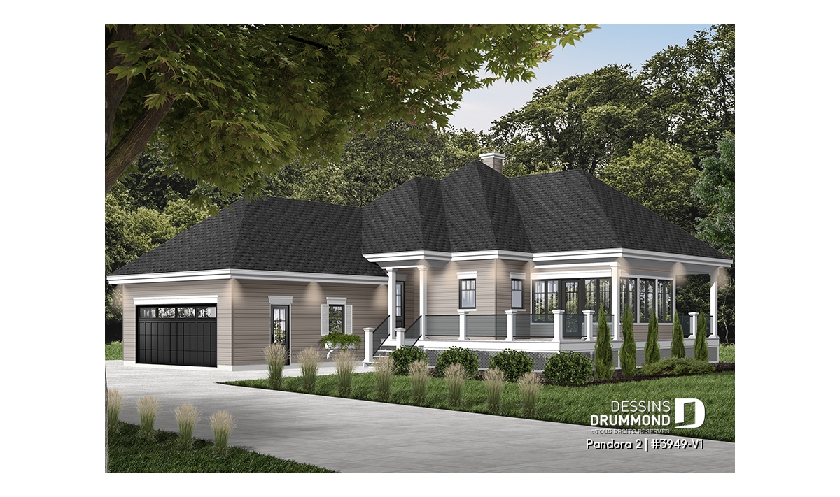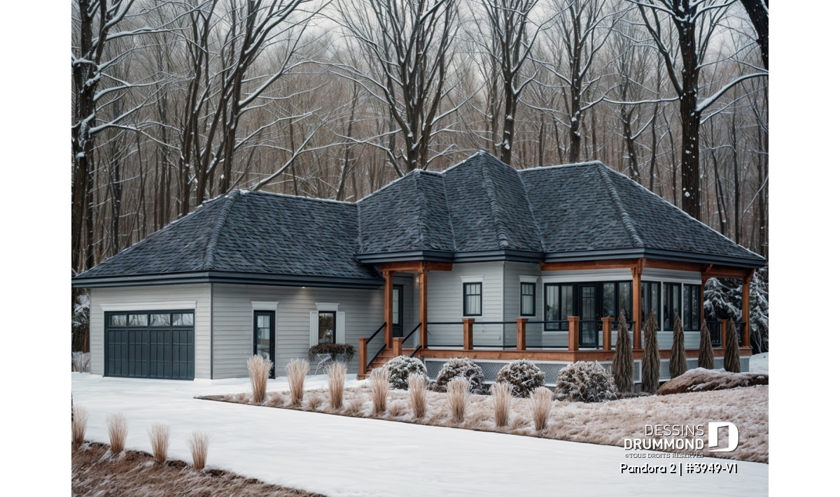 Vous appréciez le plan 3949 pour ses beaux espaces intérieurs, sa vue panoramique, sa grande terrasse et son abri-moustiquaire fort bien intégré mais vous êtes déçu du fait qu’il ne propose pas une seconde chambre au rez-de-chaussée ? Eh bien voilà que ce modèle 3949-V1 fait son apparition et vous propose, avec ses 75 pi2 additionnels, non seulement cette seconde chambre tant convoitée mais aussi un garage double attaché à la maison et, en prime, un coin laveuse/sécheuse que plusieurs apprécieront au rez-de-chaussée.