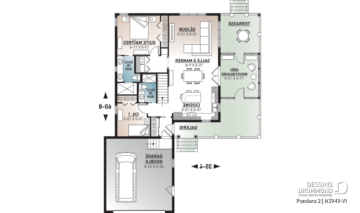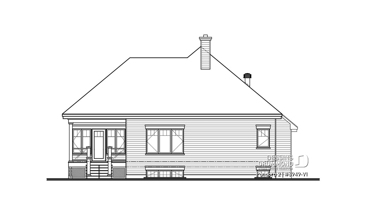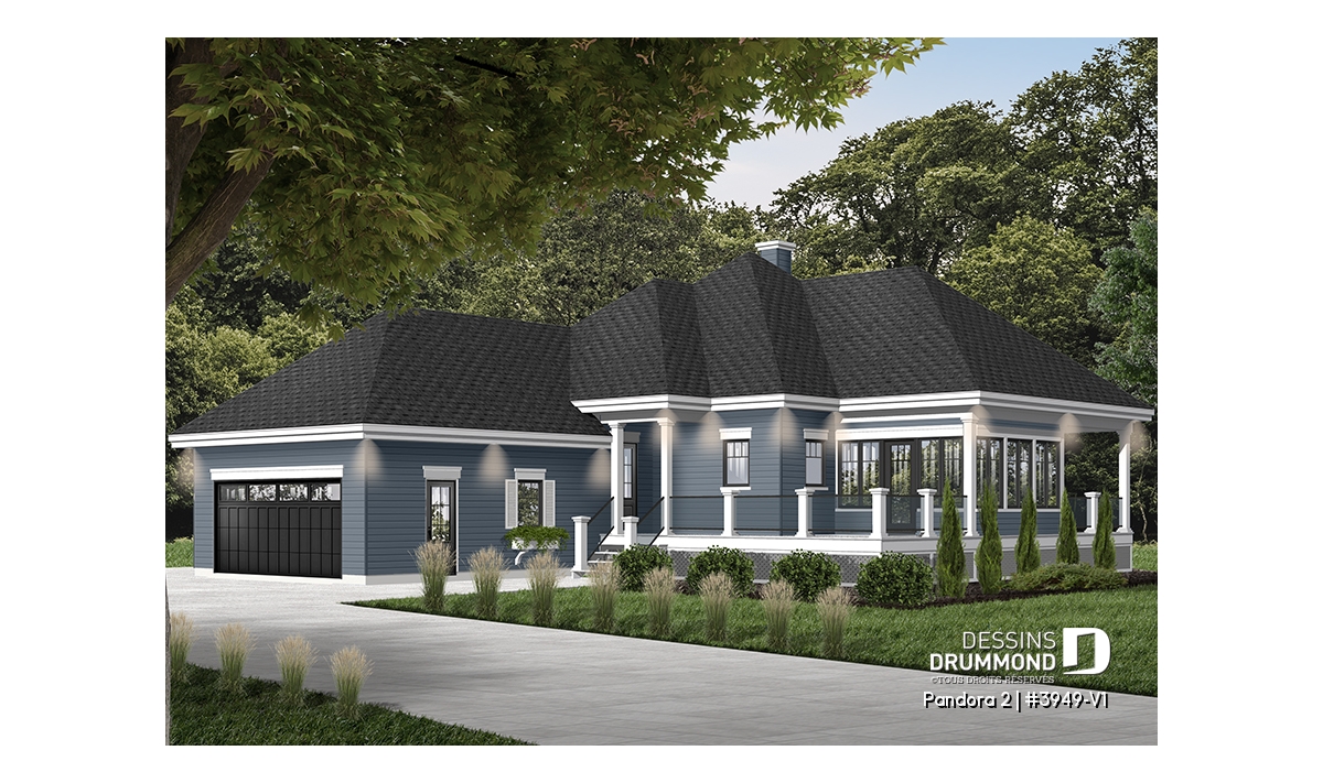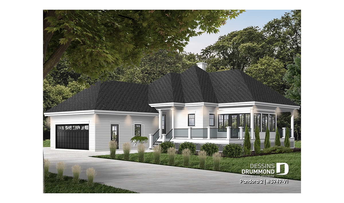 Vous appréciez le plan 3949 pour ses beaux espaces intérieurs, sa vue panoramique, sa grande terrasse et son abri-moustiquaire fort bien intégré mais vous êtes déçu du fait qu’il ne propose pas une seconde chambre au rez-de-chaussée ? Eh bien voilà que ce modèle 3949-V1 fait son apparition et vous propose, avec ses 75 pi2 additionnels, non seulement cette seconde chambre tant convoitée mais aussi un garage double attaché à la maison et, en prime, un coin laveuse/sécheuse que plusieurs apprécieront au rez-de-chaussée.