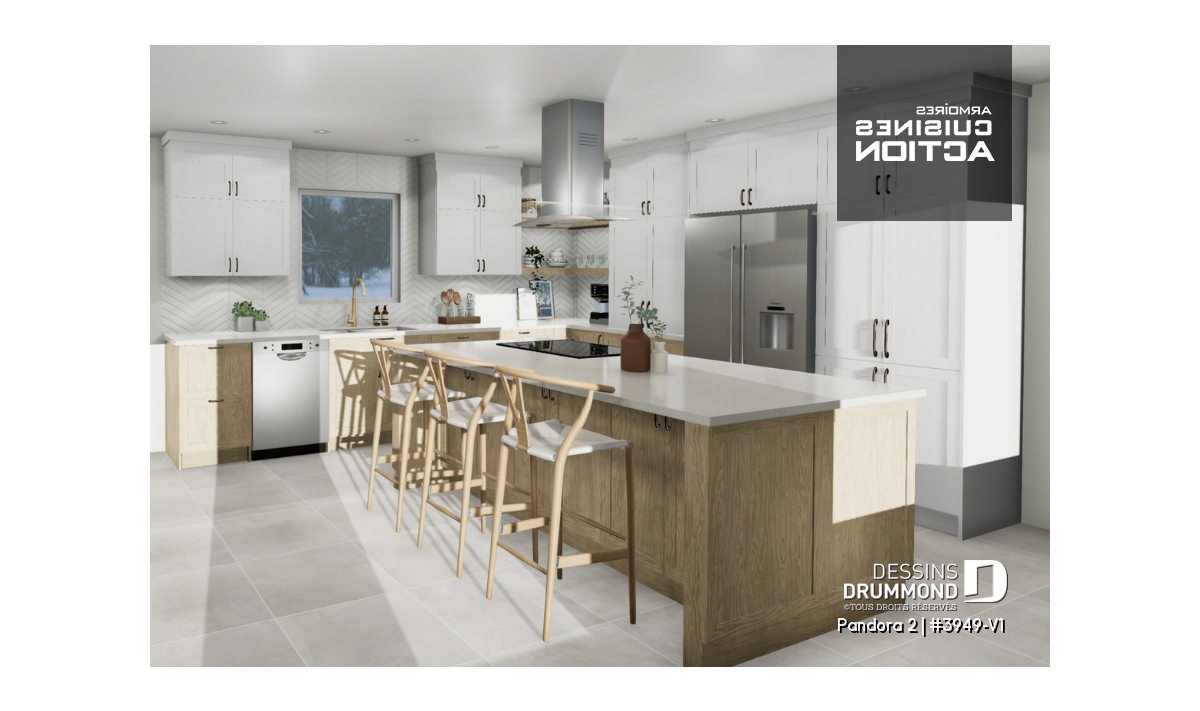 Ainsi, à l’instar du plan d’origine 3949, ce modèle version suggère une cuisine fort logeable, avec îlot-lunch central, et entièrement ouverte sur une salle à manger et une salle de séjour abondamment fenêtrées et dotées de portes-jardin donnant accès, sur ce 3949-V1, directement au solarium. Il en va aussi d’une chambre des maîtres de beau format qui devient suite des maîtres avec l’acquisition de sa propre salle de bain pour laquelle on assiste à l’élimination du bain et à l’aménagement d’une douche de 72po x 42po comme tant recherchée.