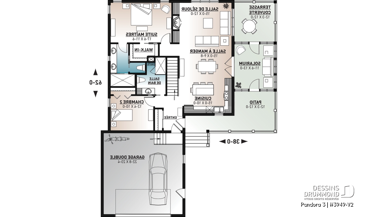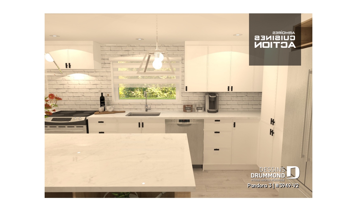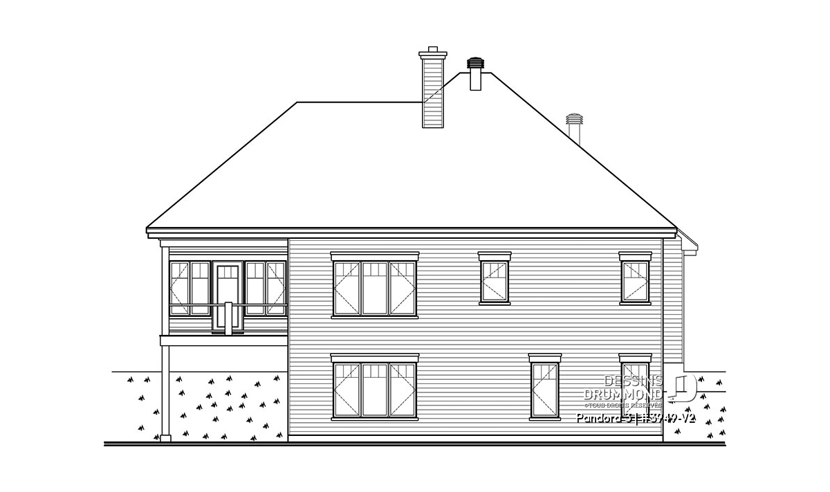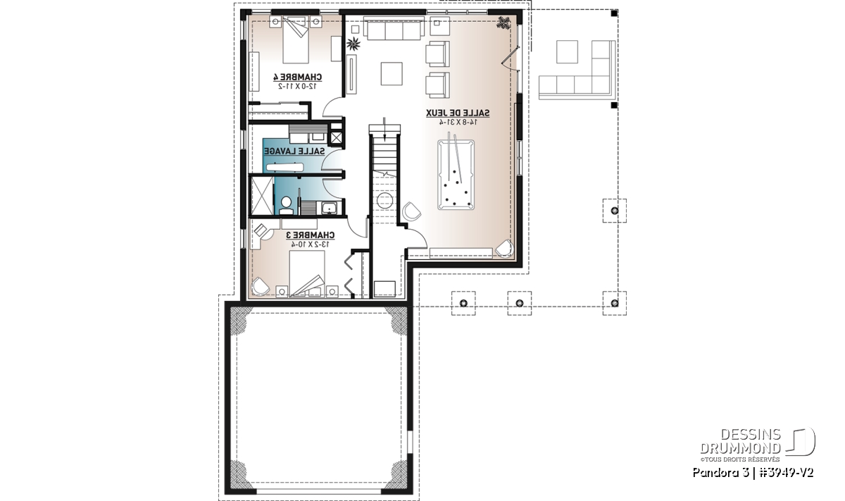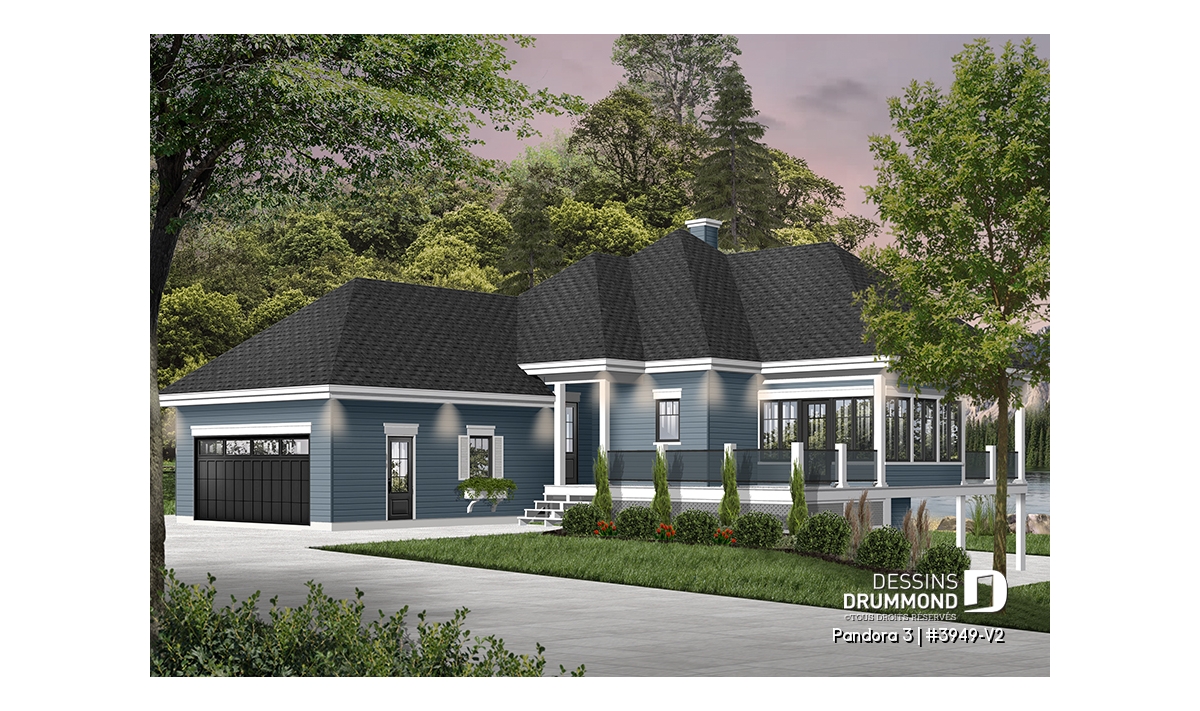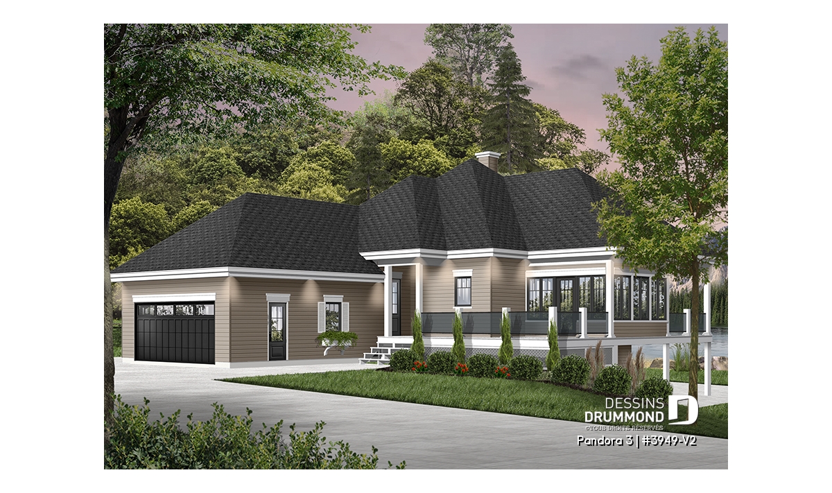 Vous appréciez le plan de chalet Dessins Drummond # 3949 ou # 3949-V1 (ou plan plain-pied de style chalet 4-saisons) pour ses beaux espaces intérieurs, sa vue panoramique, ses grandes terrasses et son solarium fort bien intégré près de la salle à manger, mais vous êtes déçus du fait qu’il ne propose pas davantage de chambres et d’aires communes ? Eh bien voilà que ce modèle de chalet Dessins Drummond # 3949-V2 fait son apparition et vous propose 2 chambres additionnelles et un sous-sol en rez-de-jardin entièrement aménagé! Et en bonus, un petit réaménagement de la salle de séjour et chambre des maîtres!