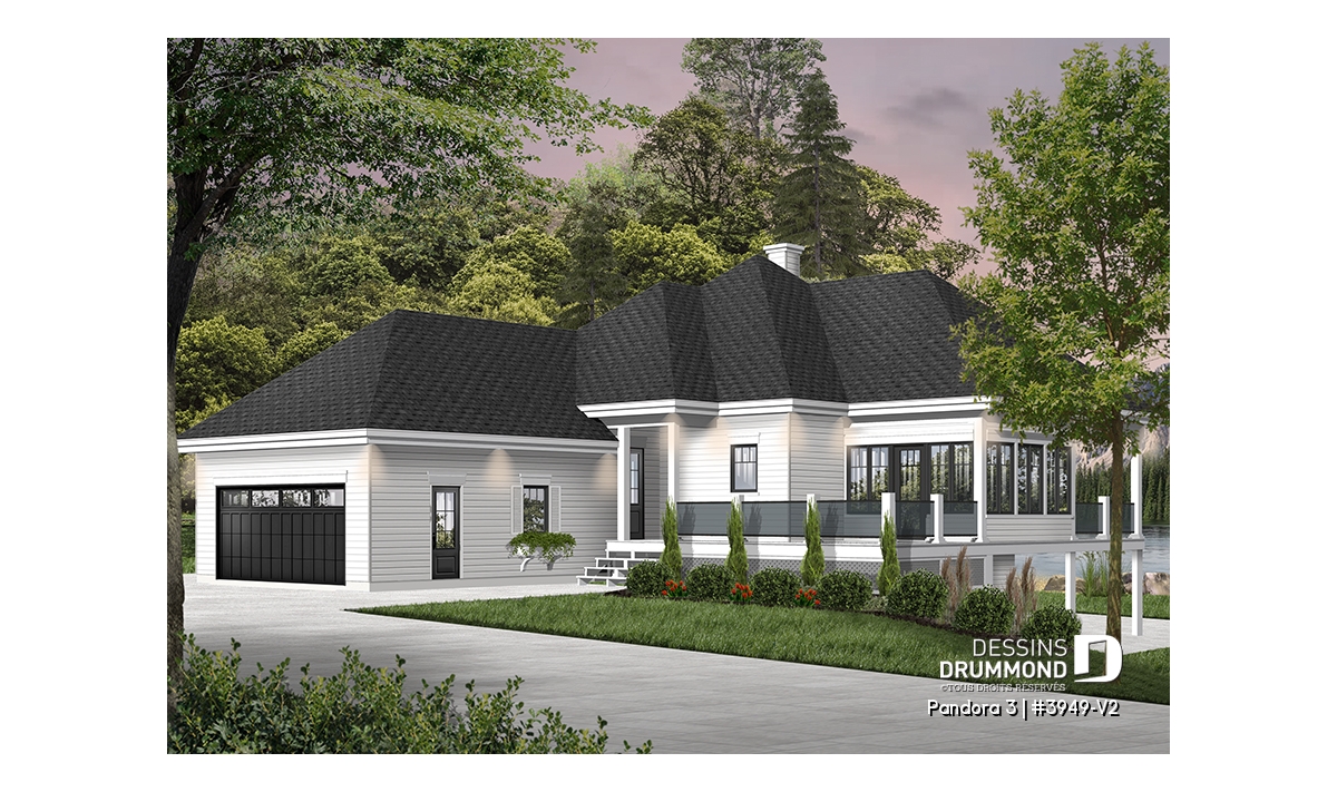 Ce modèle de chalet ou plain-pied style chalet 4-saisons propose un garage double avec accès direct à la maison, près de la cuisine. Pratique pour les retours d’épicerie!