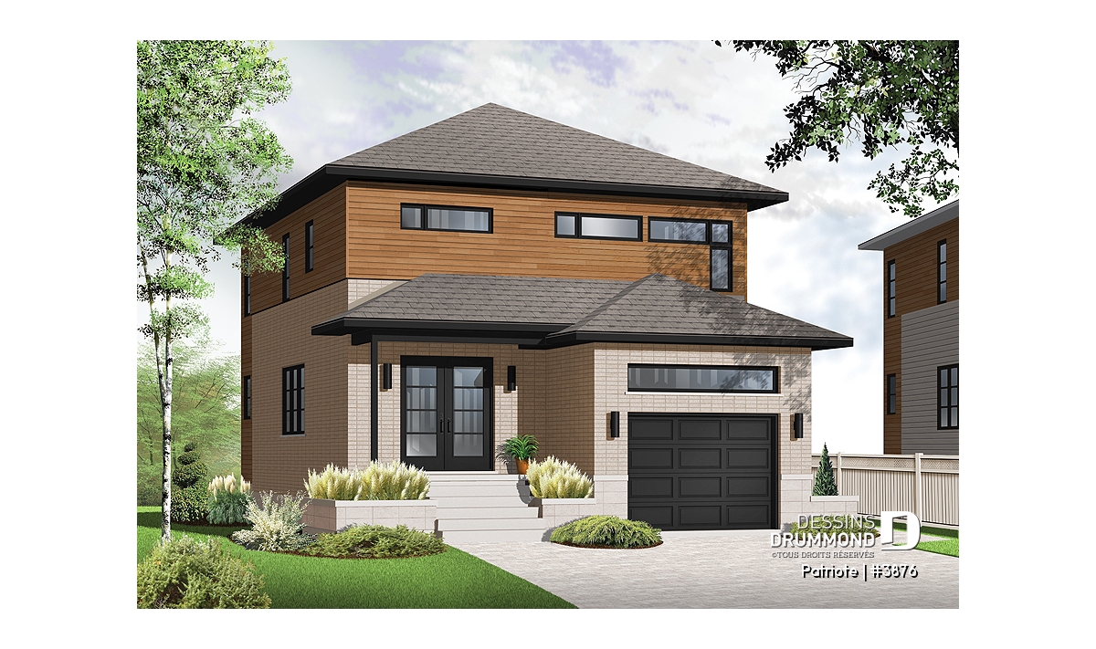 Vue avant - MODÈLE DE BASE - Plan de maison contemporaine, garage, 3 chambres, grande cuisine, superbe chambre parents, terrasse abritée - Patriote