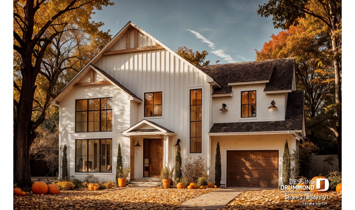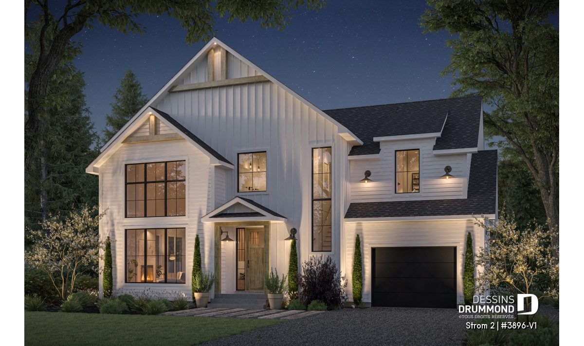 Découvrez le plan de maison STROM 2, la version Farmhouse de notre populaire plan contemporain Strom, une maison qui combine à merveille élégance moderne et charme champêtre. Cette demeure à étage a été pensée pour répondre aux besoins des familles d’aujourd’hui, offrant à la fois espaces lumineux, fonctionnalité et détails chaleureux qui font toute la différence au quotidien.