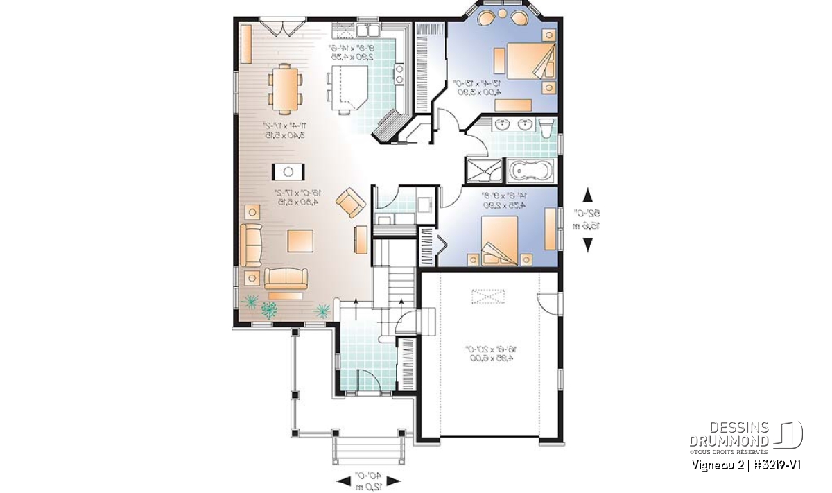 Ce plain-pied suggère donc au rez-de-chaussée et par le biais de l’élimination de la galerie arrière et d’un agrandissement de 4 pi en largeur sur toute la profondeur de la maison, des chambres plus confortables, une salle de bain avec douche indépendante de plus grand format et une vanité à deux lavabos. Sans oublier, une salle à manger plus dégagée, une cuisine avec véritable îlot-lunch central et un garage encore plus logeable avec espace boni au-dessus accessible par un escalier escamotable. Au sous-sol, cela se traduit par la présence de deux belles chambres secondaires, une salle de douche à la fois fonctionnelle et confortable, une grande salle familiale, un espace rangement ainsi qu’une chambre froide située sous la galerie avant.