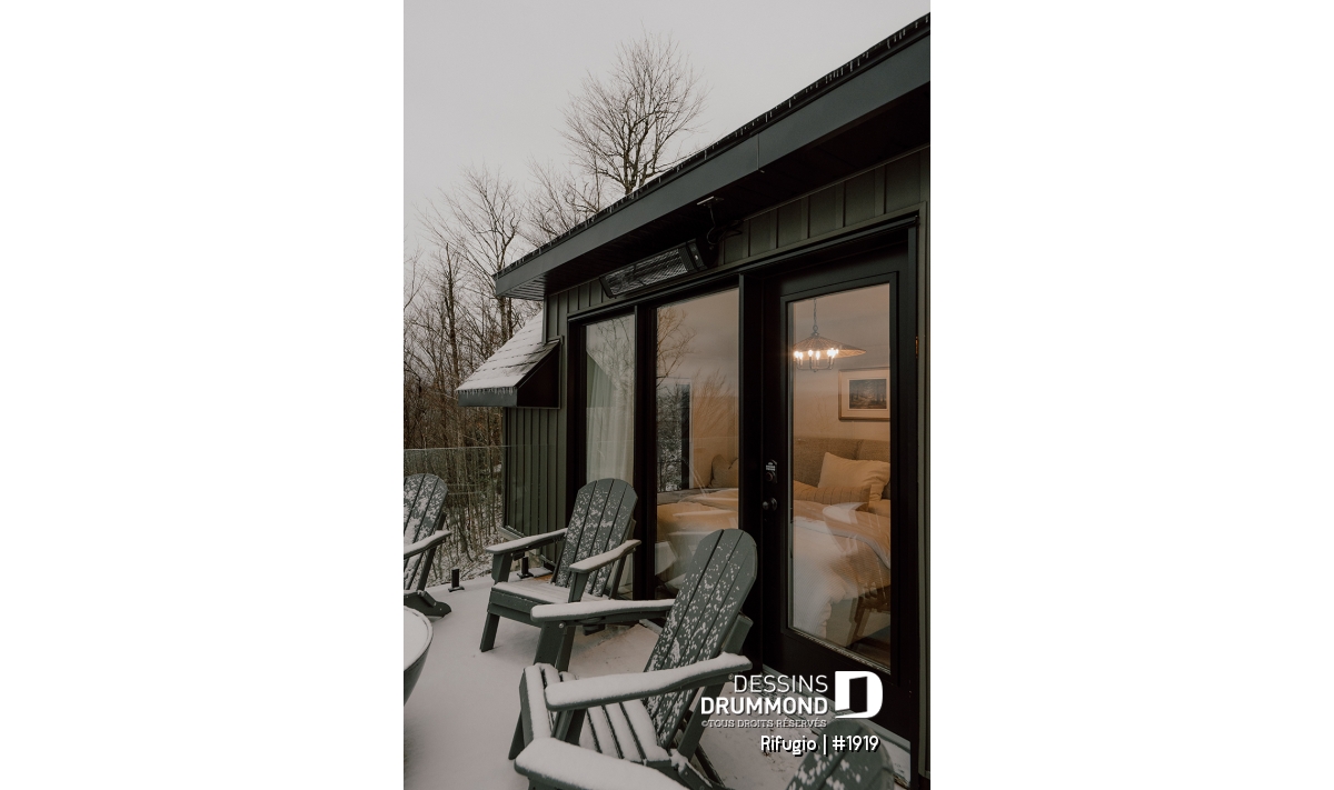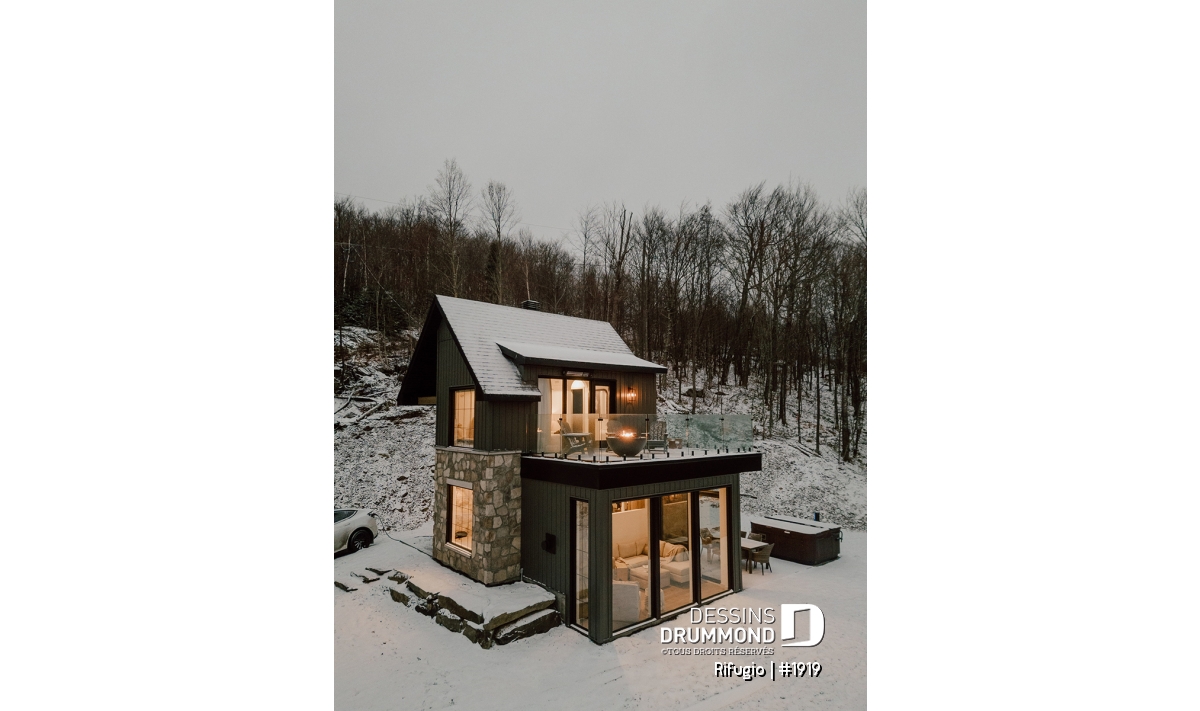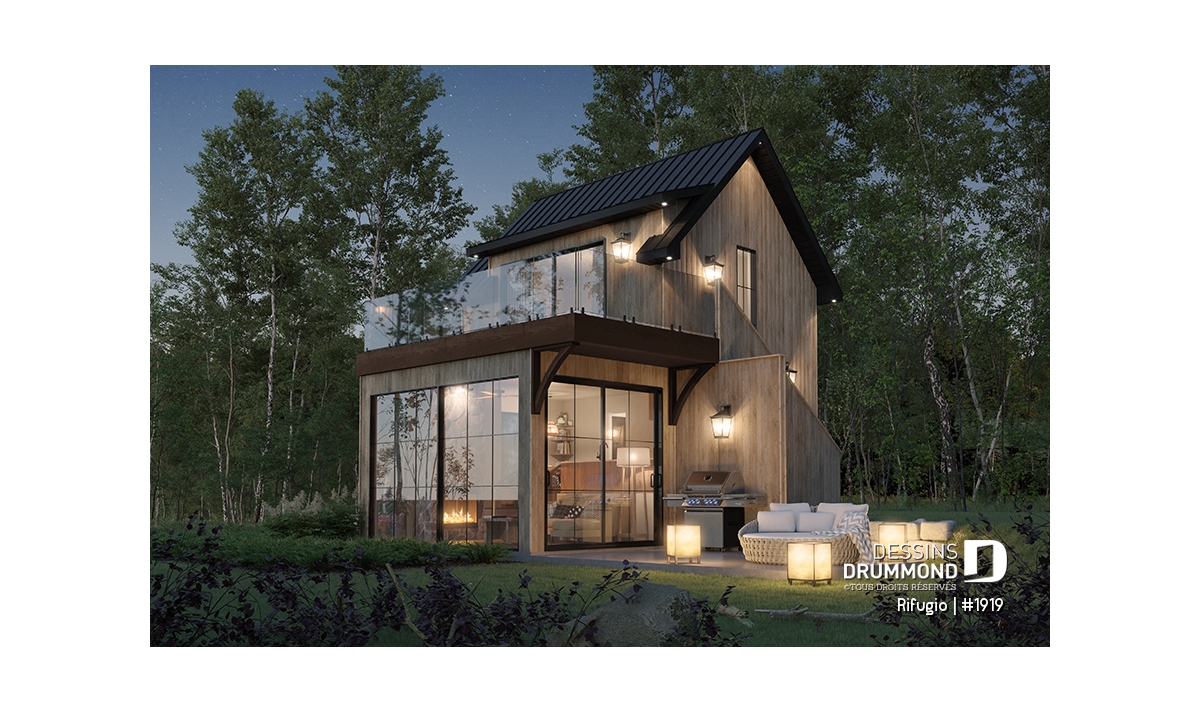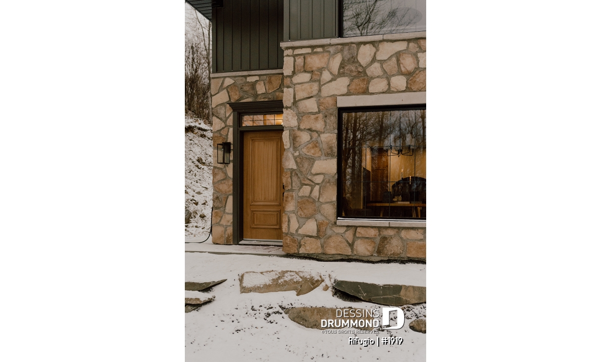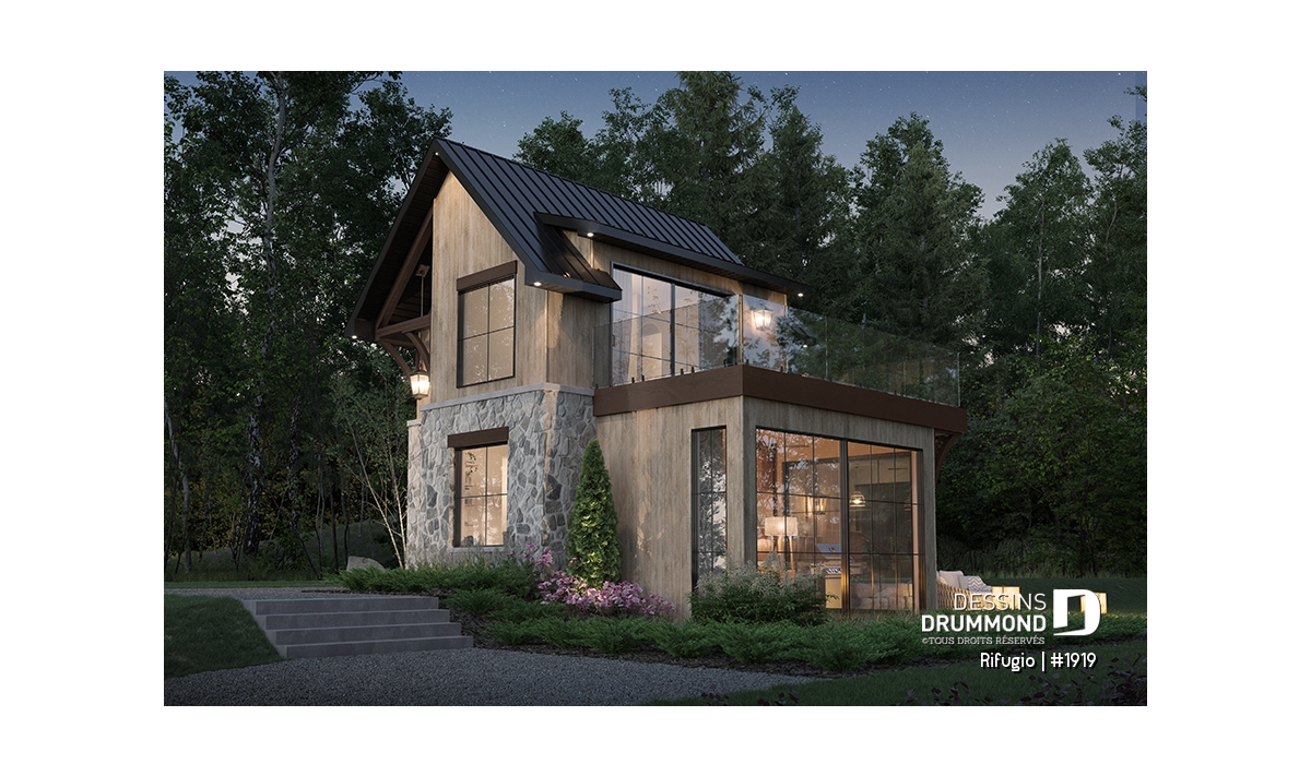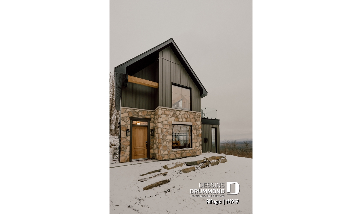 Le plan de chalet Rifugio (#1919) propose 741 pi.ca., judicieusement aménagés sur 2 étages. Malgré son format compact, il offre plusieurs attraits qui sauront plaire à une petite famille ou à deux couples en vacances. Il a d'ailleurs été conçu avec une pensée de location éventuelle. Son look extérieur de pierre et de bois s'harmonise parfaitement à un décor en forêt et offre d'emblée la perspective d'un séjour de repos, zen et sans tracas!