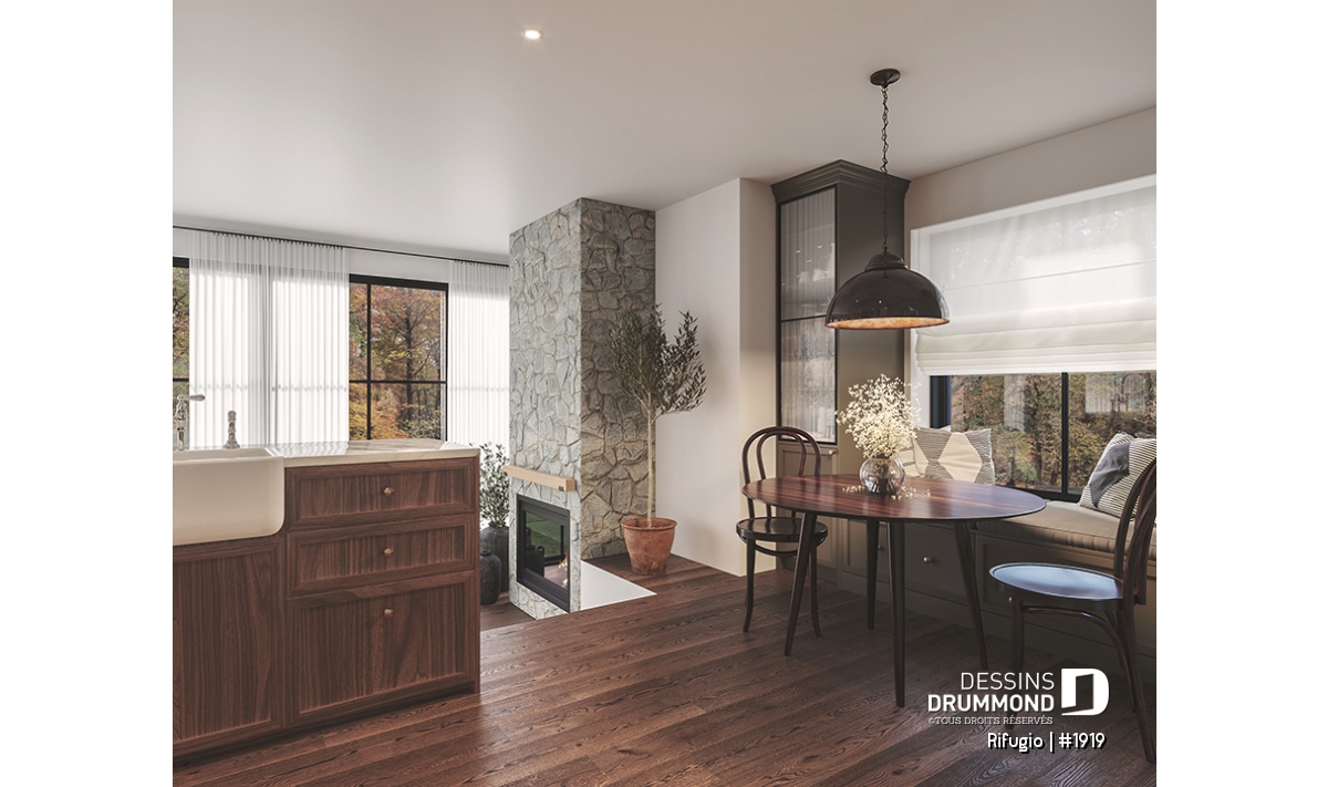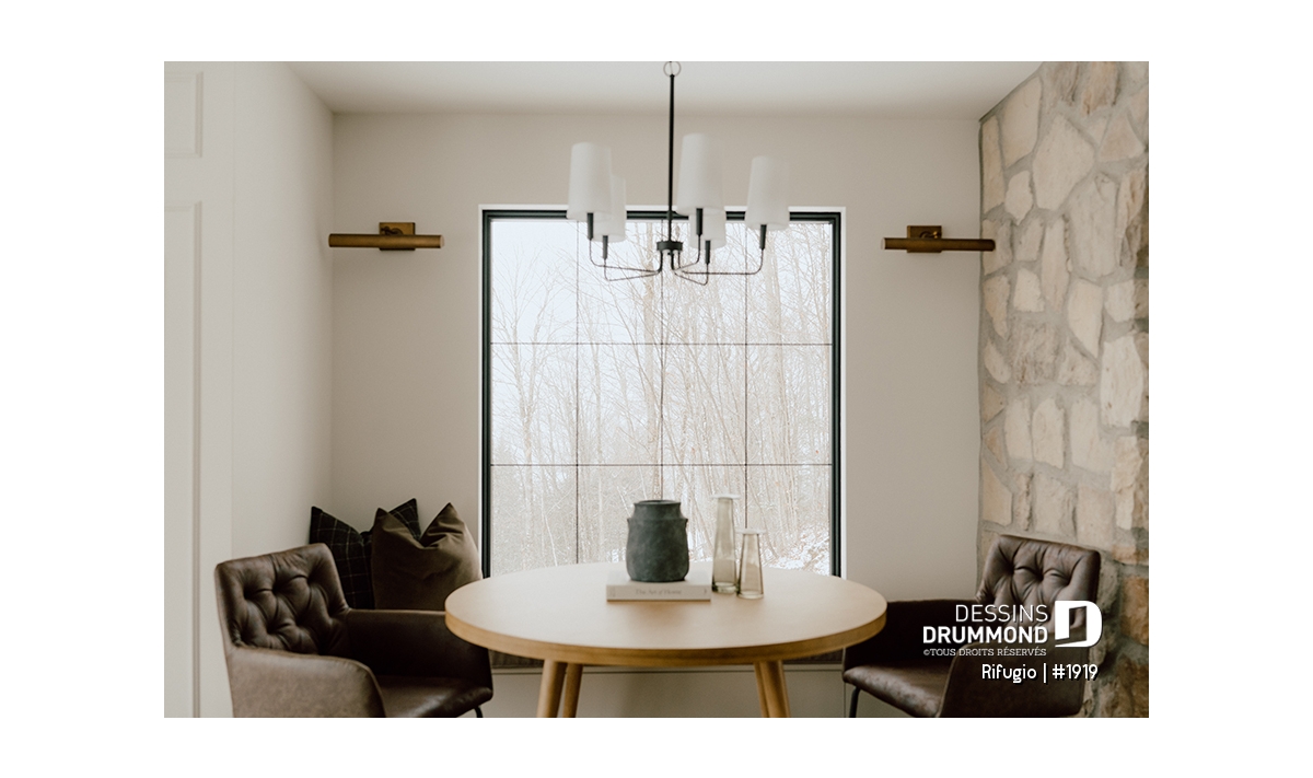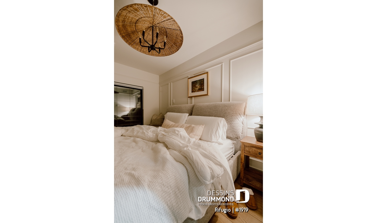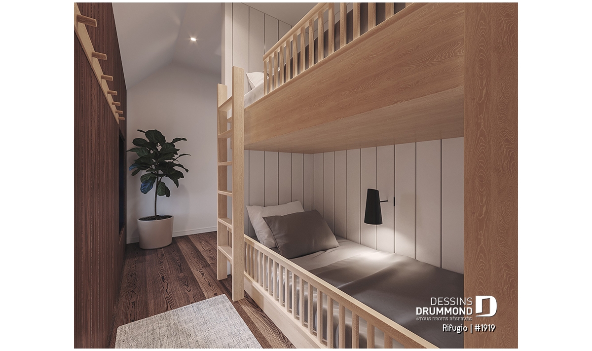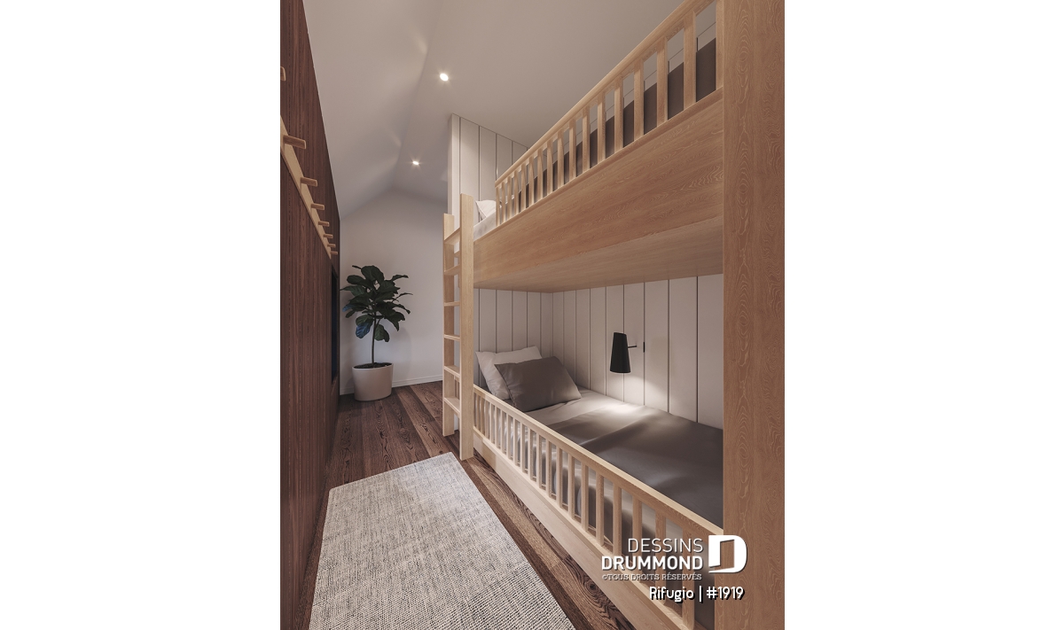 Le plan de chalet Rifugio (#1919) propose 741 pi.ca., judicieusement aménagés sur 2 étages. Malgré son format compact, il offre plusieurs attraits qui sauront plaire à une petite famille ou à deux couples en vacances. Il a d'ailleurs été conçu avec une pensée de location éventuelle. Son look extérieur de pierre et de bois s'harmonise parfaitement à un décor en forêt et offre d'emblée la perspective d'un séjour de repos, zen et sans tracas!