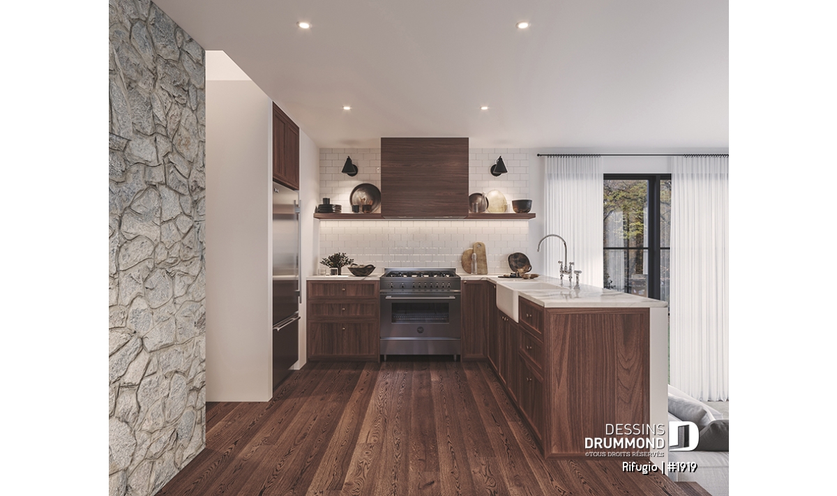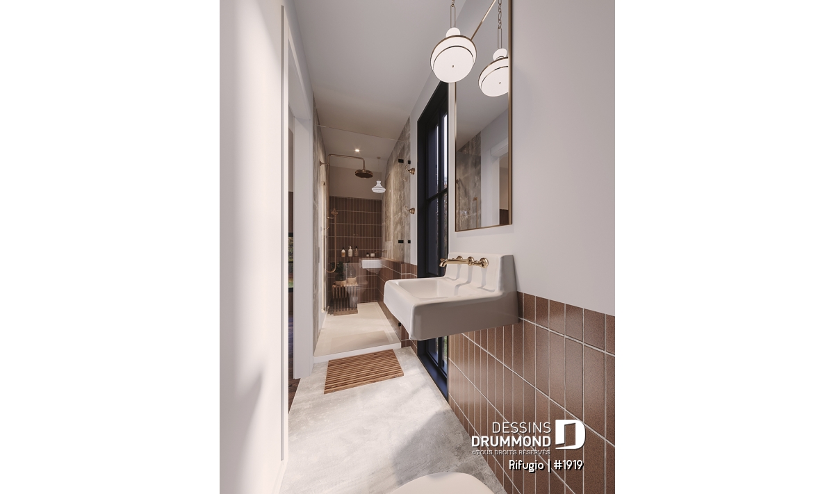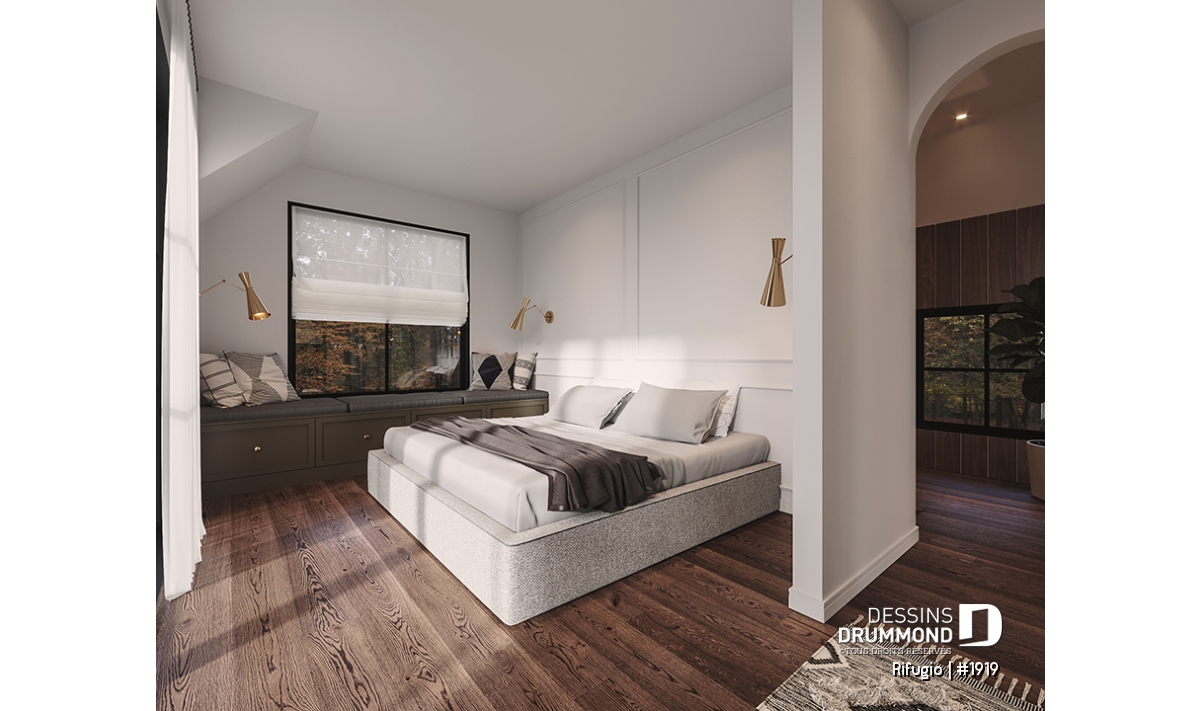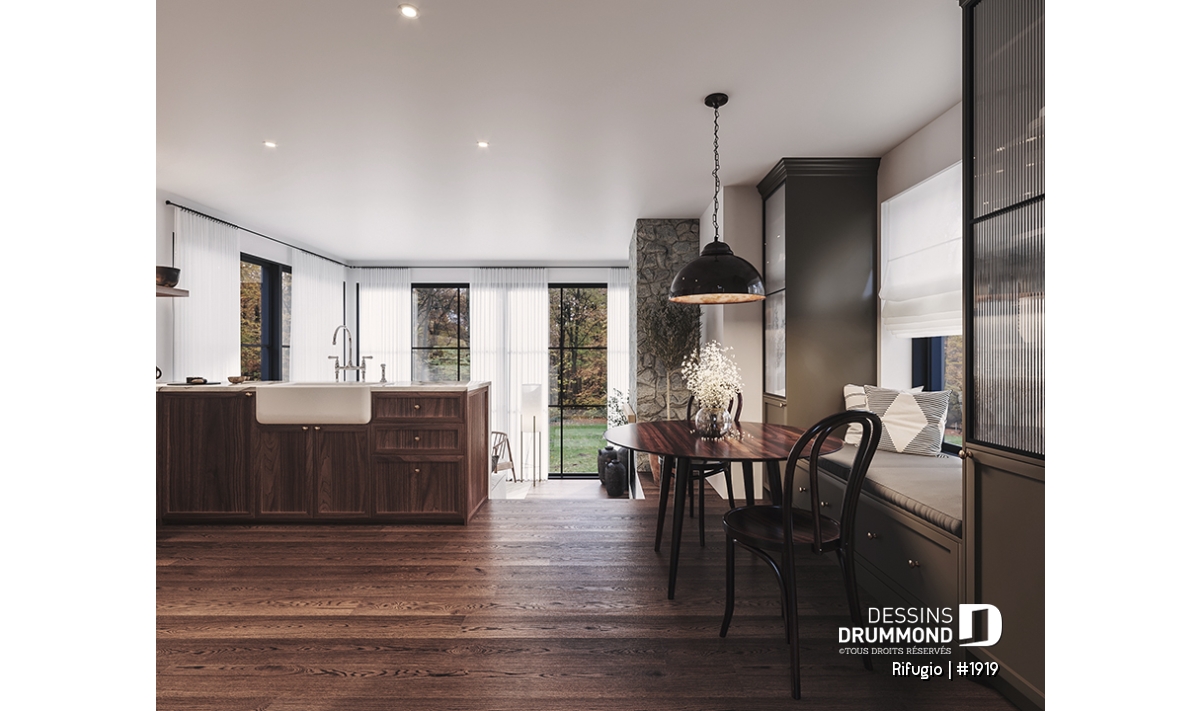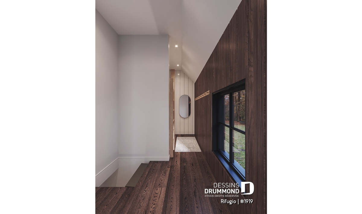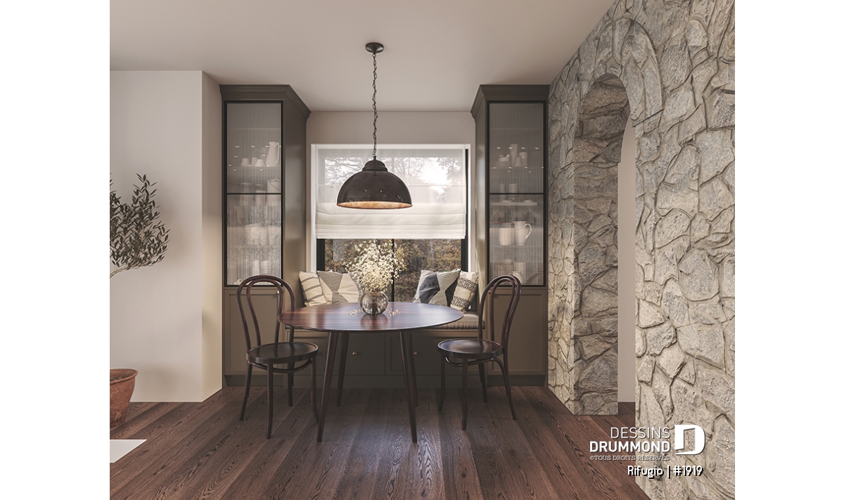 Le plan de chalet Rifugio (#1919) propose 741 pi.ca., judicieusement aménagés sur 2 étages. Malgré son format compact, il offre plusieurs attraits qui sauront plaire à une petite famille ou à deux couples en vacances. Il a d'ailleurs été conçu avec une pensée de location éventuelle. Son look extérieur de pierre et de bois s'harmonise parfaitement à un décor en forêt et offre d'emblée la perspective d'un séjour de repos, zen et sans tracas!