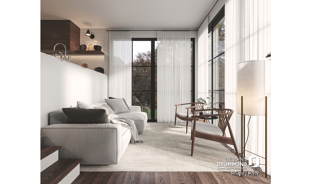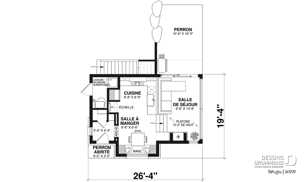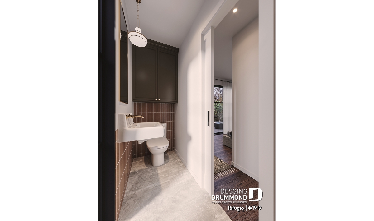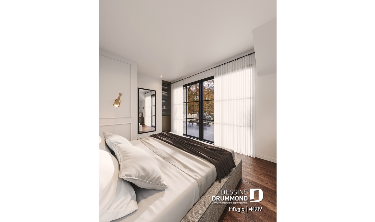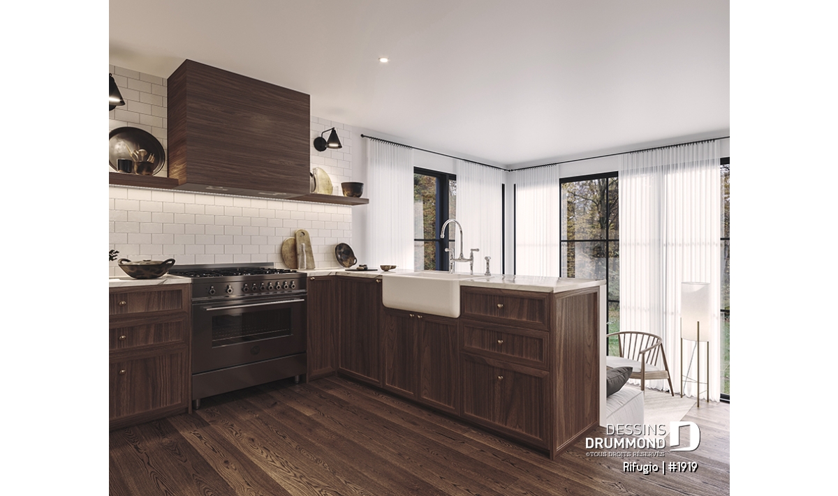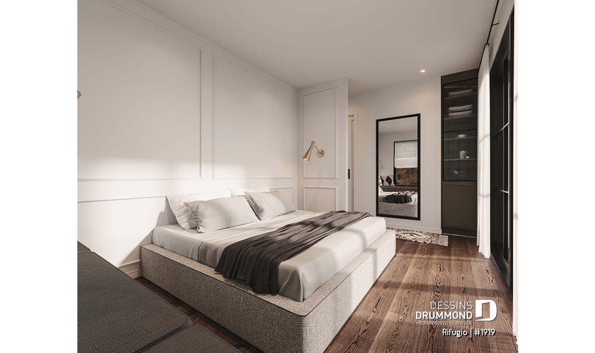 Le plan de chalet Rifugio (#1919) propose 741 pi.ca., judicieusement aménagés sur 2 étages. Malgré son format compact, il offre plusieurs attraits qui sauront plaire à une petite famille ou à deux couples en vacances. Il a d'ailleurs été conçu avec une pensée de location éventuelle. Son look extérieur de pierre et de bois s'harmonise parfaitement à un décor en forêt et offre d'emblée la perspective d'un séjour de repos, zen et sans tracas!