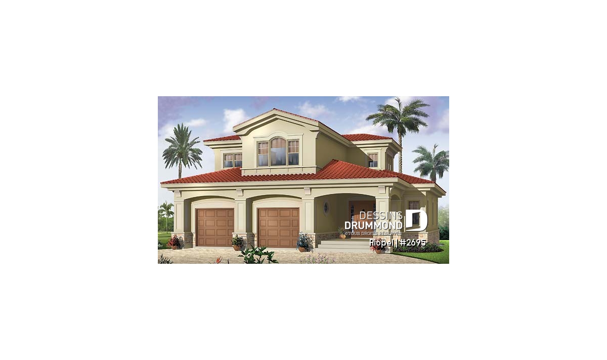 Maison de style méditerranéen, aire ouverte, foyer central, 3 chambre, garage double et bureau
