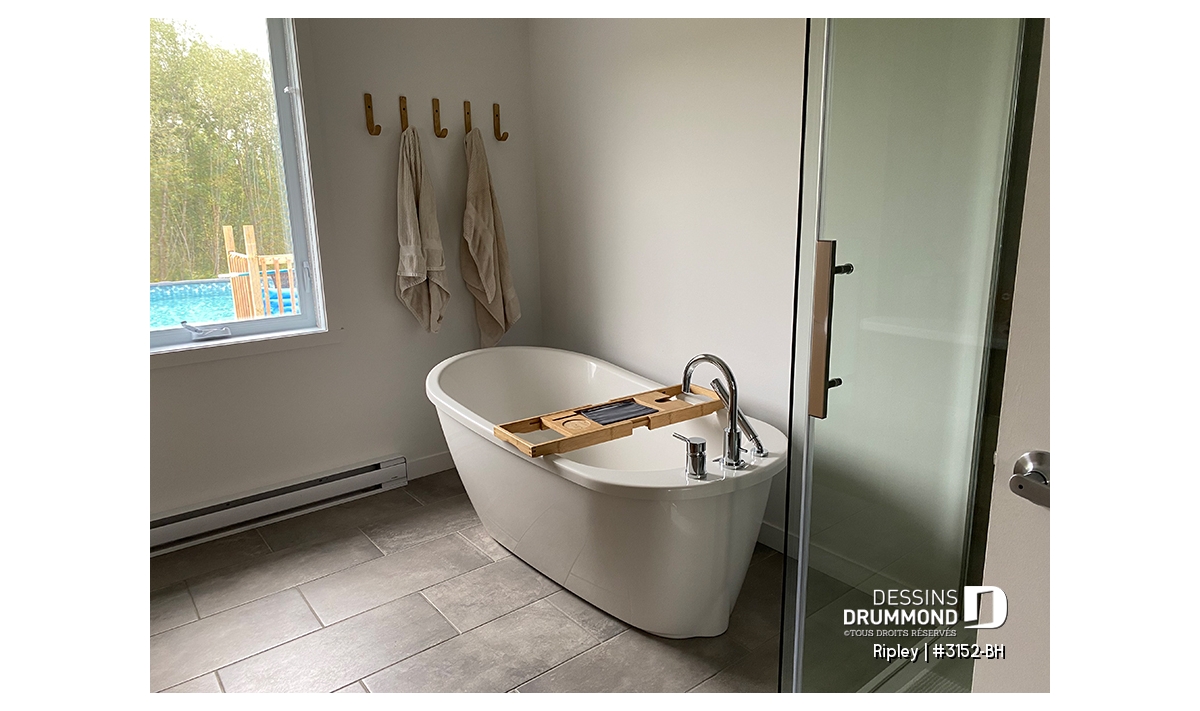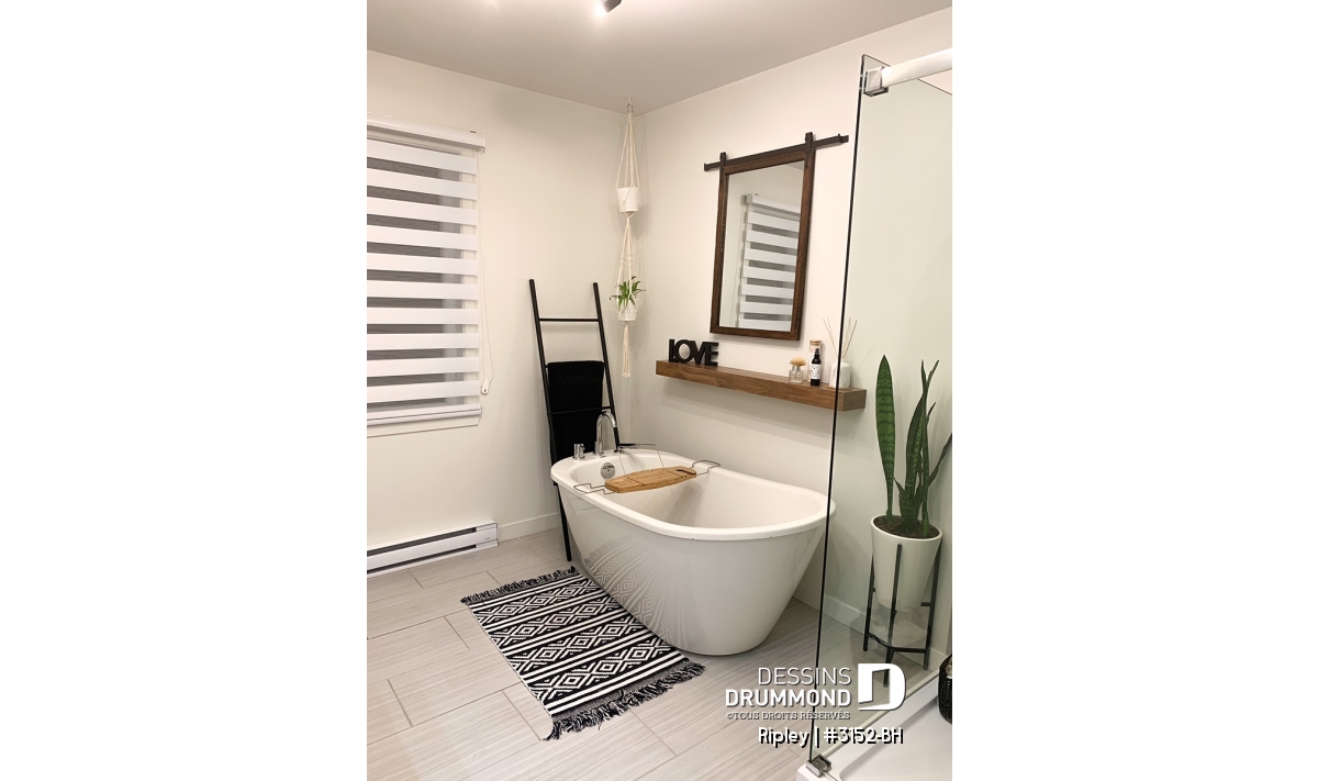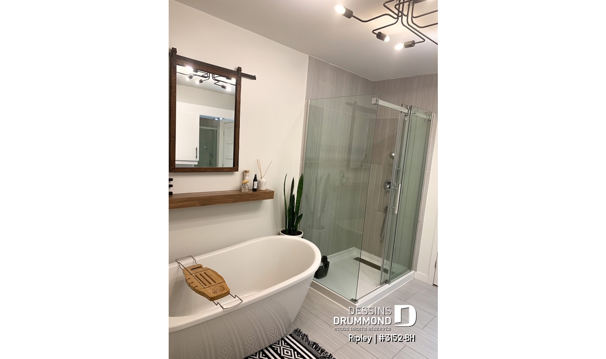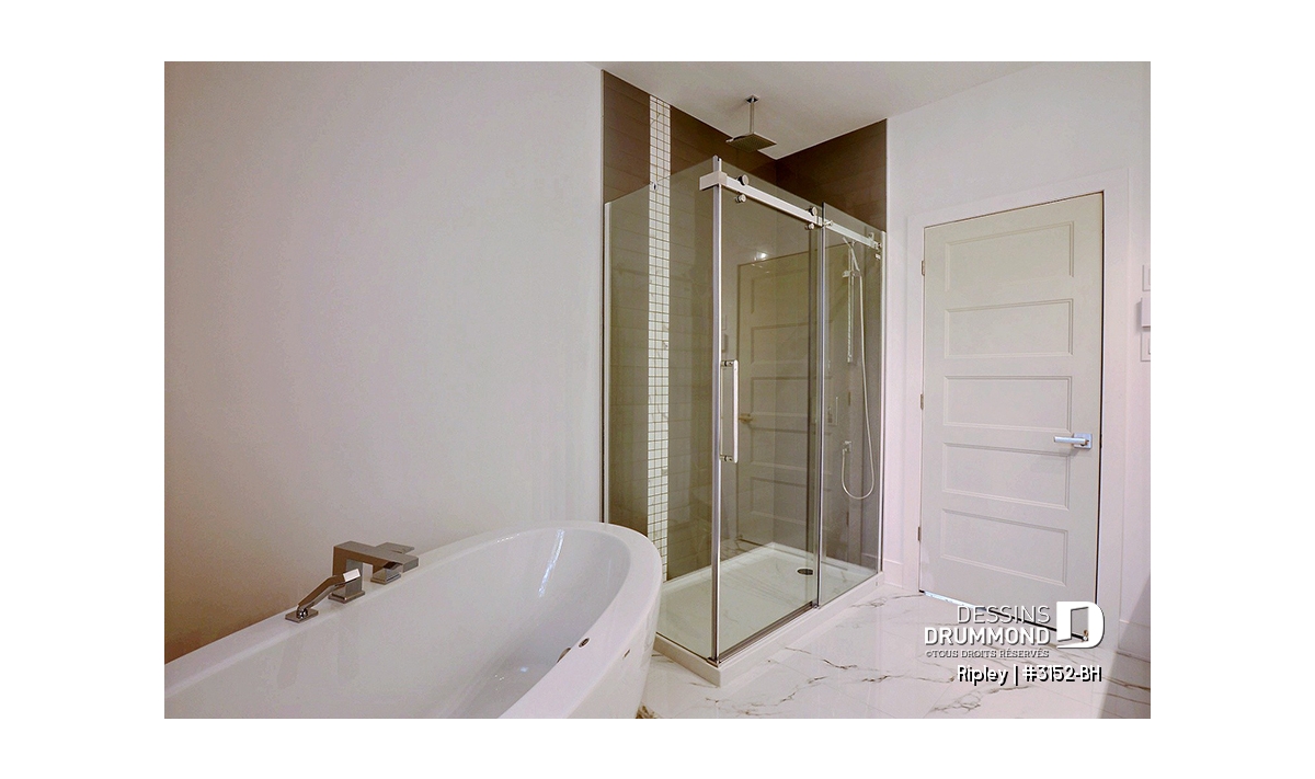Salle de bain complète incluant grande douche et bain séparée, ainsi qu'un coin laveuse et sécheuse.