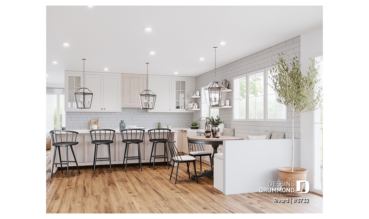 Cuisine avec garde-manger et coin dinette avec banquette.