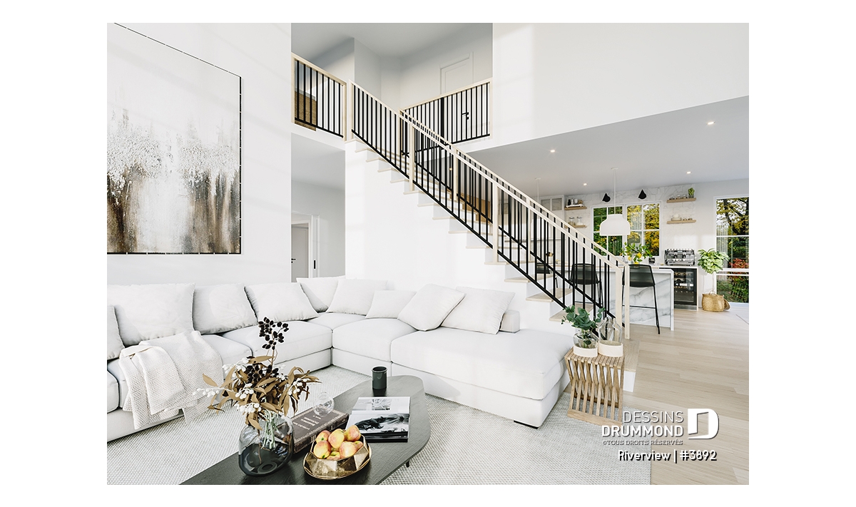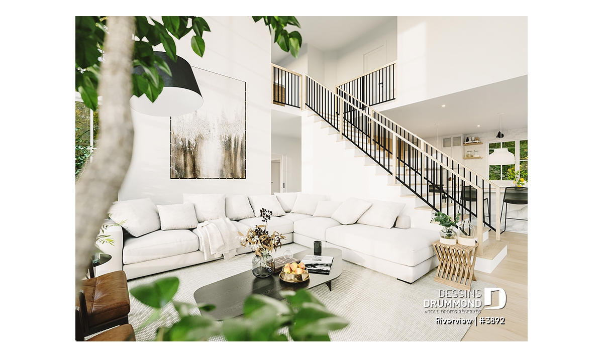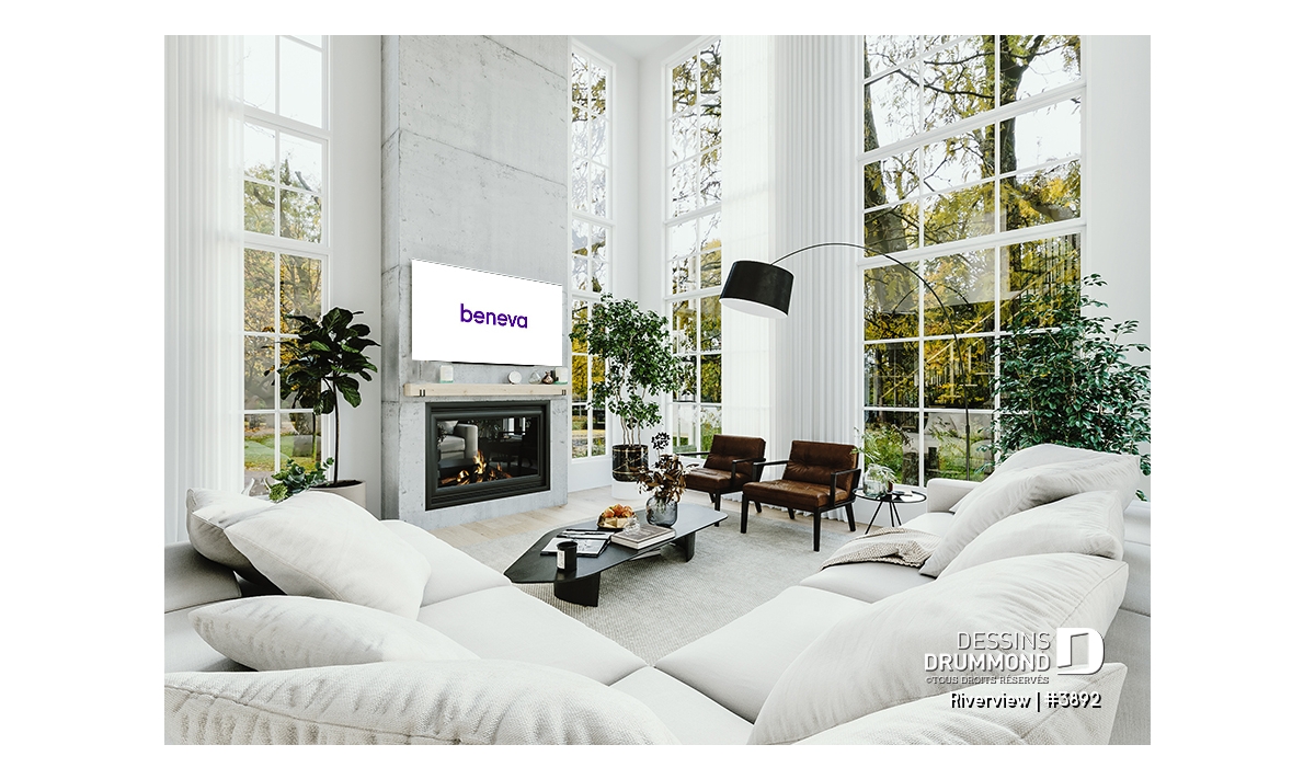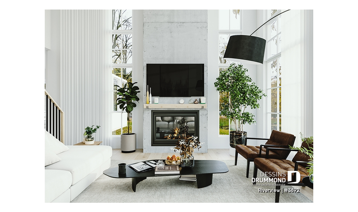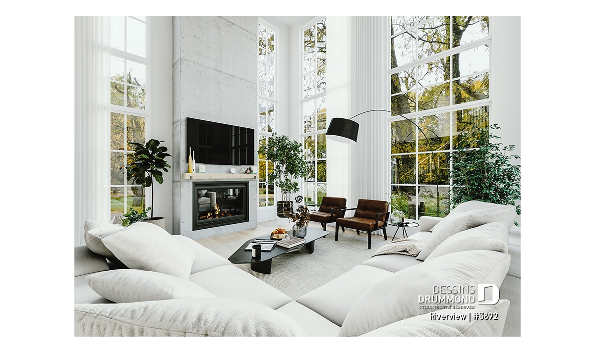 Superbe luminosité à la salle de séjour, qui a un plafond de 18'6'', ainsi qu'un foyer.