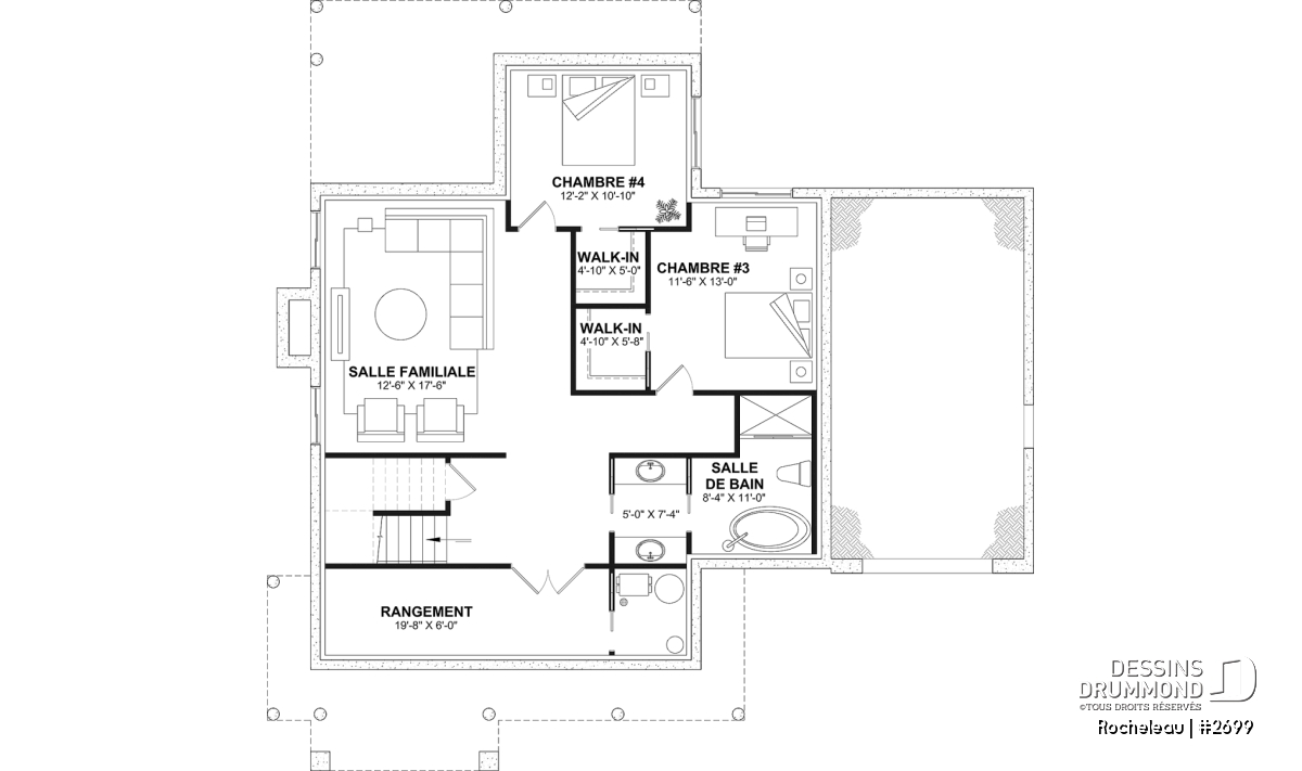 *Si vous souhaitez acheter le plan du sous-sol aménagé, veuillez sélectionner cette option dans le panier d'achat, dans la section "Sélectionner votre fondation". Si vous ne sélectionnez pas cette option, vous recevrez le sous-sol non fini, sans frais additionnel.