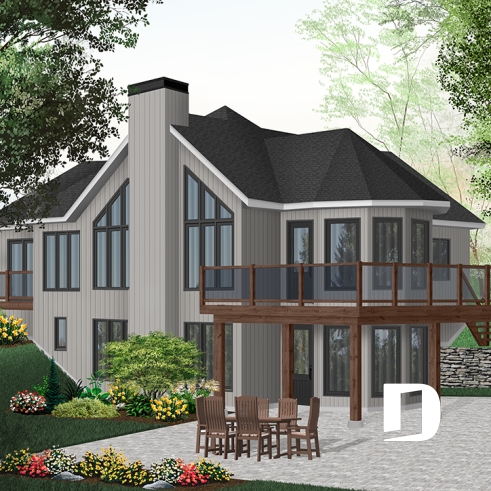 Vue arrière - MODÈLE DE BASE - Plan de maison genre chalet avec garage, 2 terrasses, 2 chambres, sous-sol en rez-de-jardin - Rockspring 2