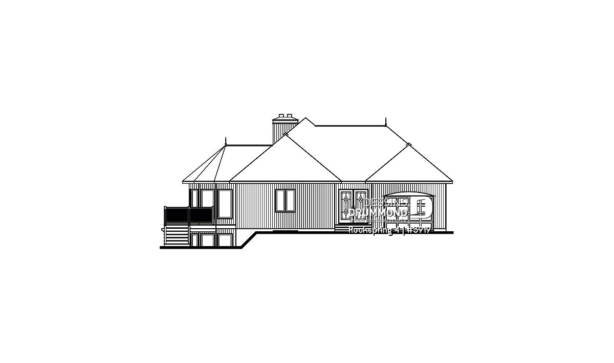 Version couleur no. 1 - Vue arrière - Plan de maison avec fondation en rez-de-jardin, 2 à 4 chambres, foyer, plafond cathédral - Rockspring 4