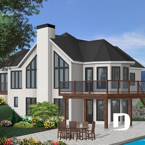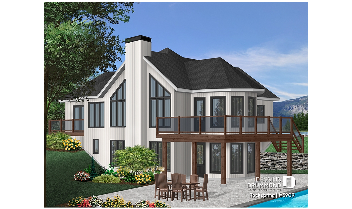 Plan de chalet, suite des maîtres avec balcon, séjour ouvert sur la cuisine, foyer, sous-sol non-fini