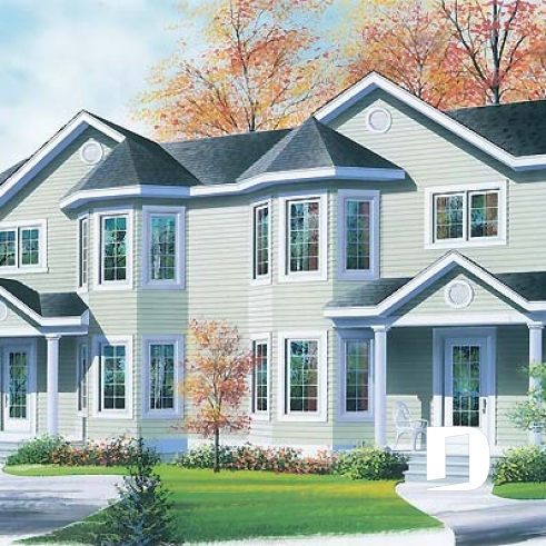 Plan de semi-détaché à étage, 2 à 3 chambres, 2 s. de bain, style victorien, belle fenestration, garde-manger
