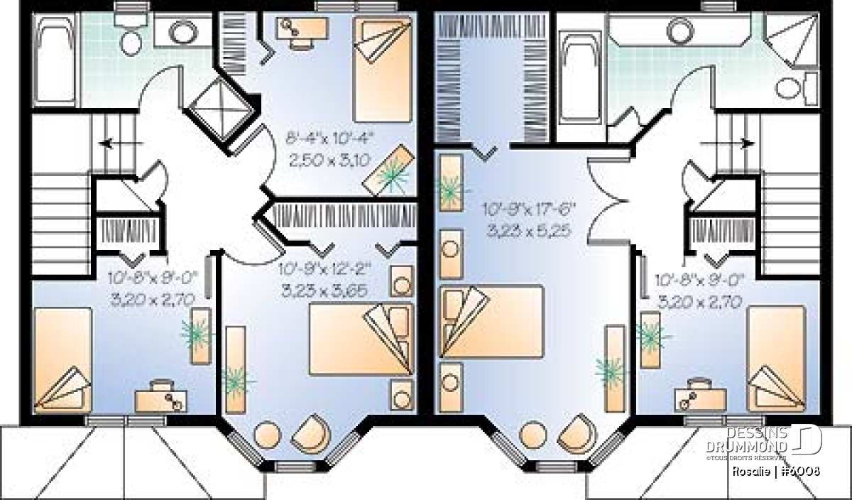 Plan de maison jumelée à étage, avec option de 2 ou 3 chambres.