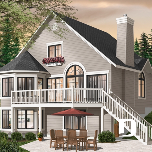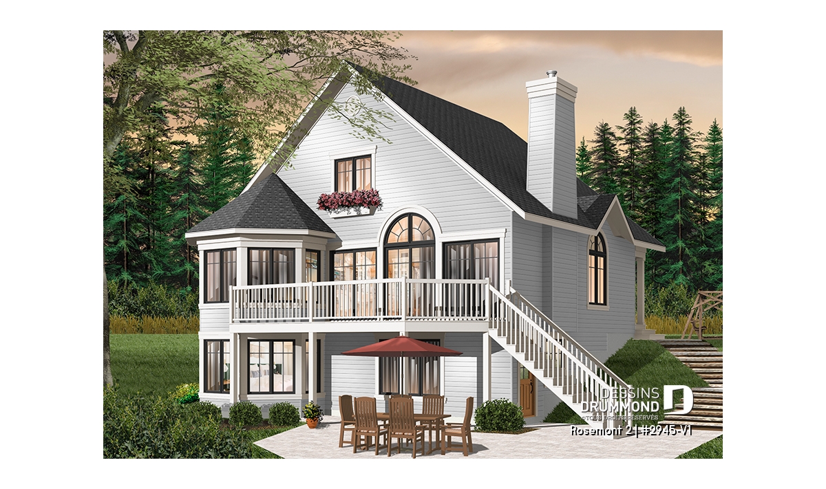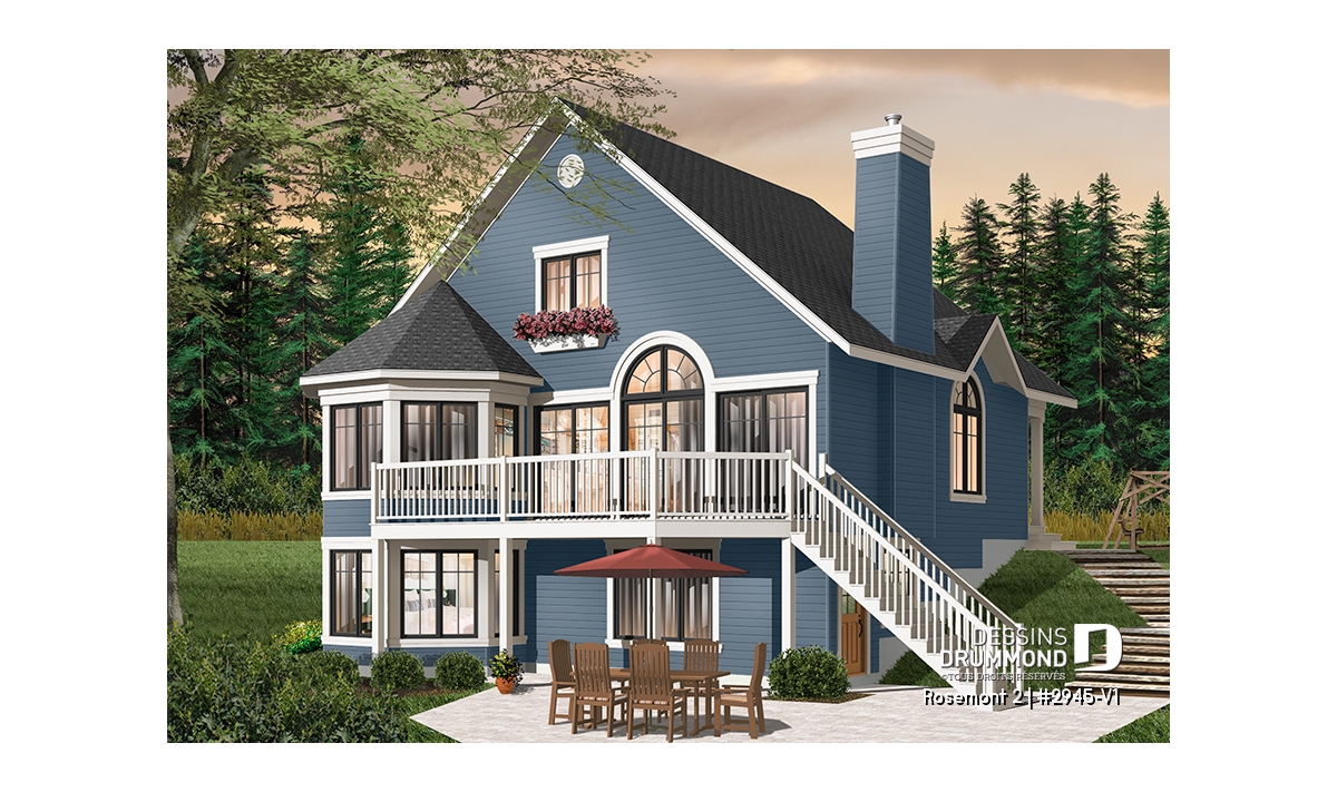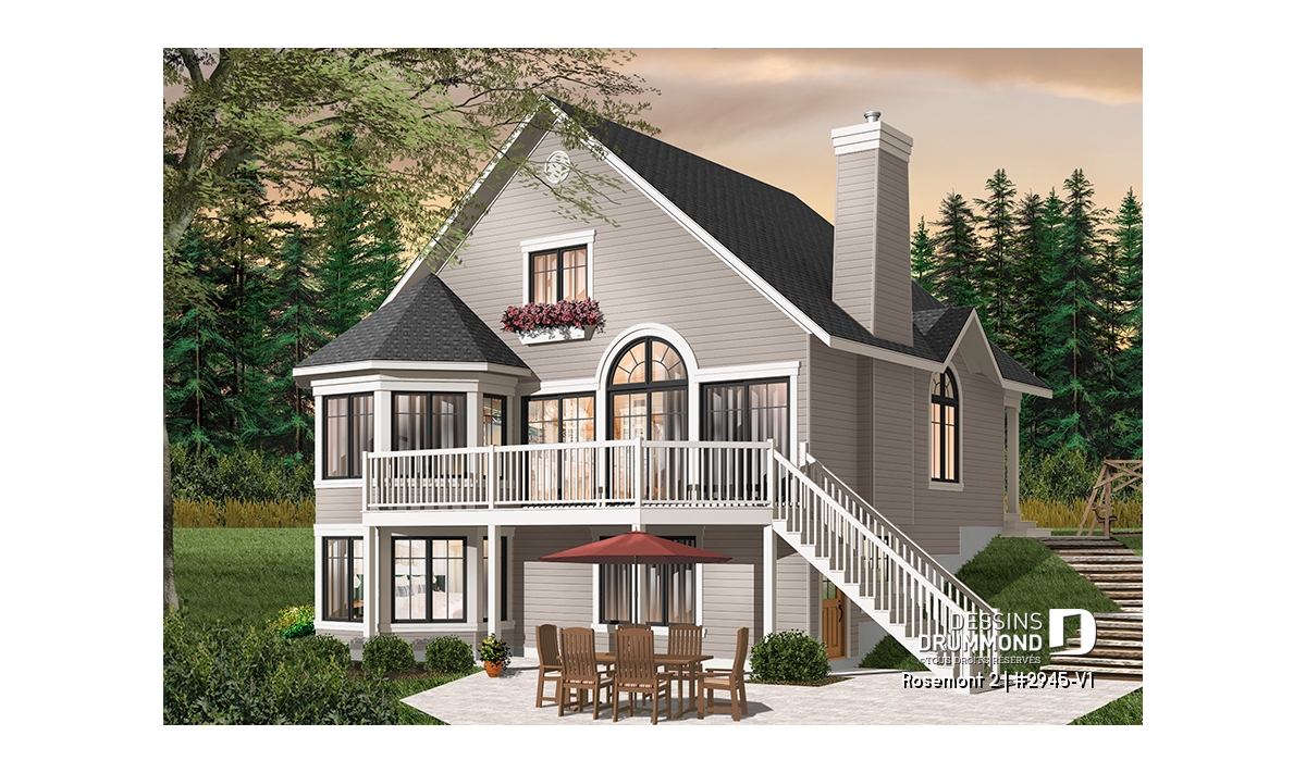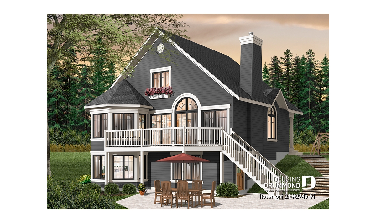 À l’extérieur, plus précisément sur cette vue arrière proposée, on constate que le sous-sol est entièrement exposé et qu’une porte de service est aménagée tout juste derrière l’escalier de la terrasse. Ainsi, il devient facile de consacrer une partie du sous-sol à l’aménagement d’un bachelor avec vue panoramique et comme souvent recherché par certains propriétaires.