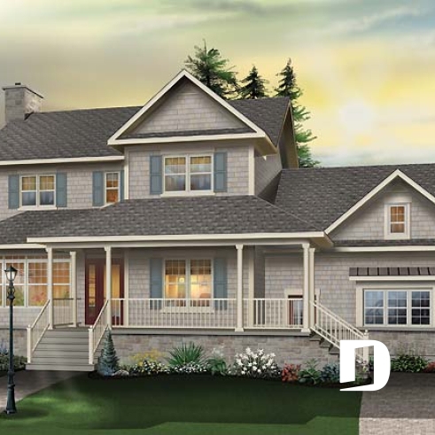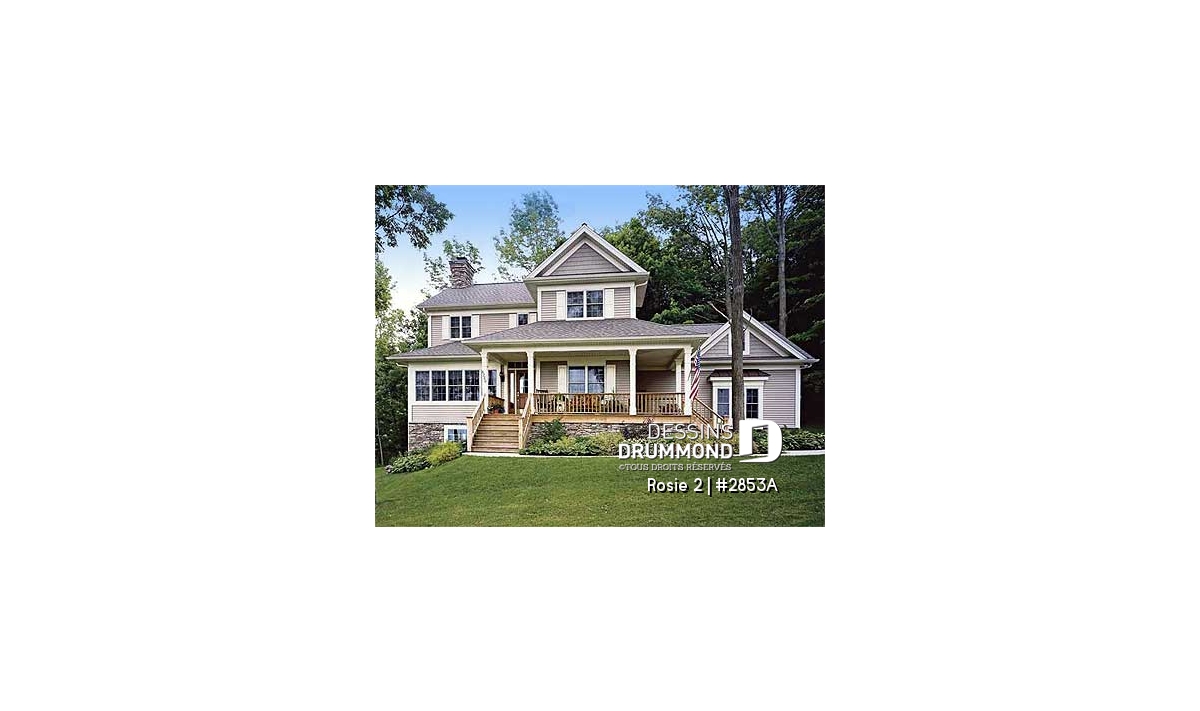 Probablement le modèle de Dessins Drummond qui plait le plus des deux côtés de la frontière Canado-américaine, ce modèle se veut tout d’abord élégant avec sa grande galerie en façade, ses toitures simplifiées et ses ouvertures bien balancées et discret de la façon dont il dissimule si bien son garage double.